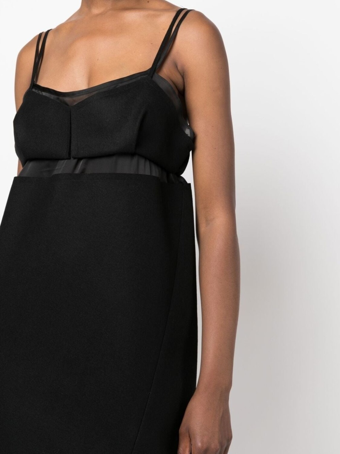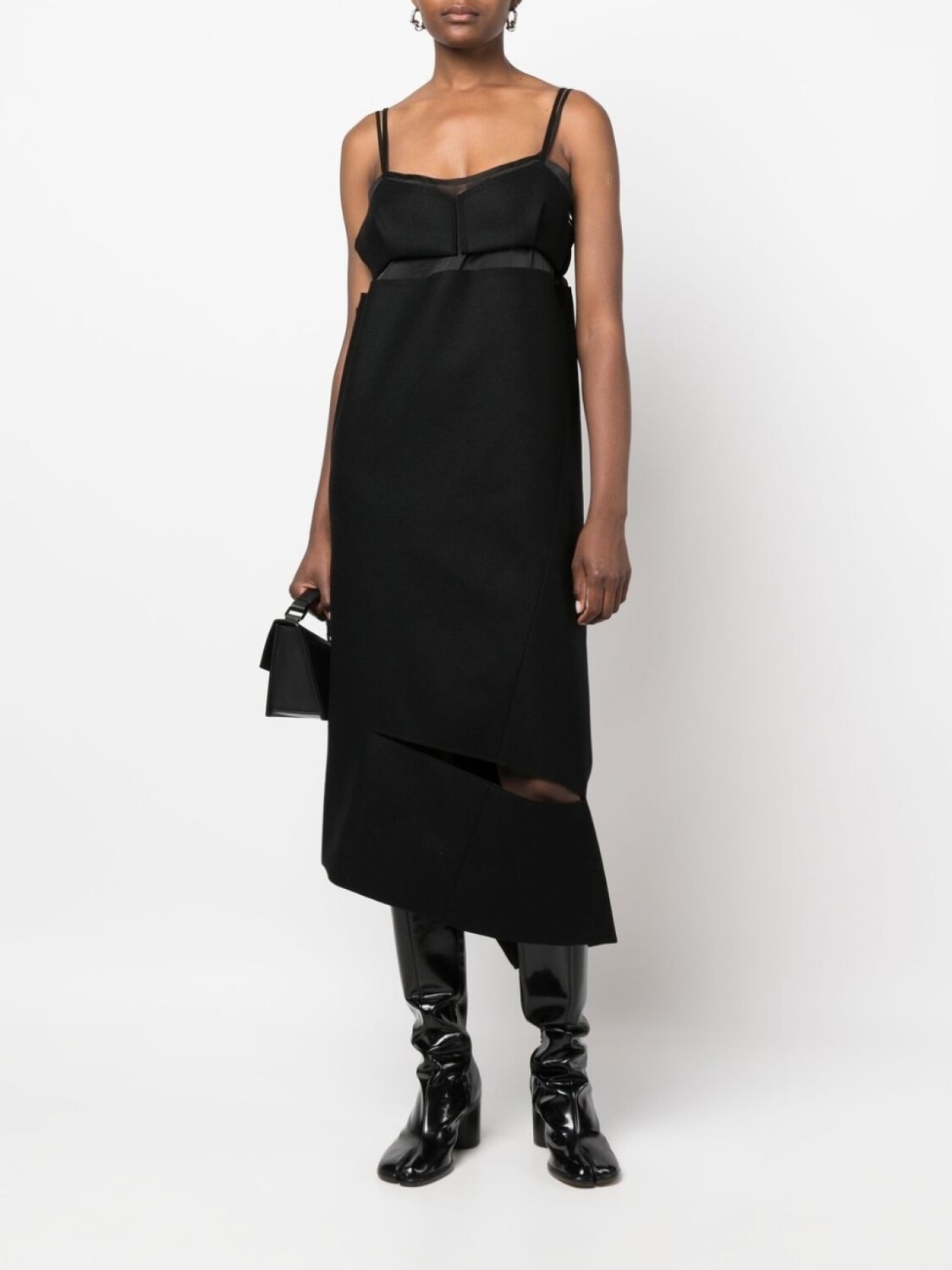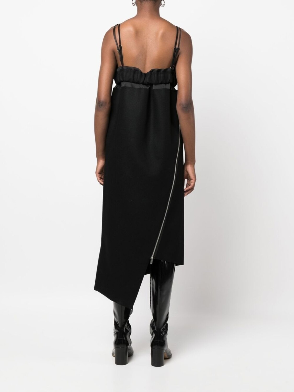 Черный, шерсть, асимметричная форма, вырезные детали, деталь с молнией, полупрозрачные вставки, U-образный вырез, регулируемые тонкие бретели, квадратный вырез на спине, без рукавов и длина миди.