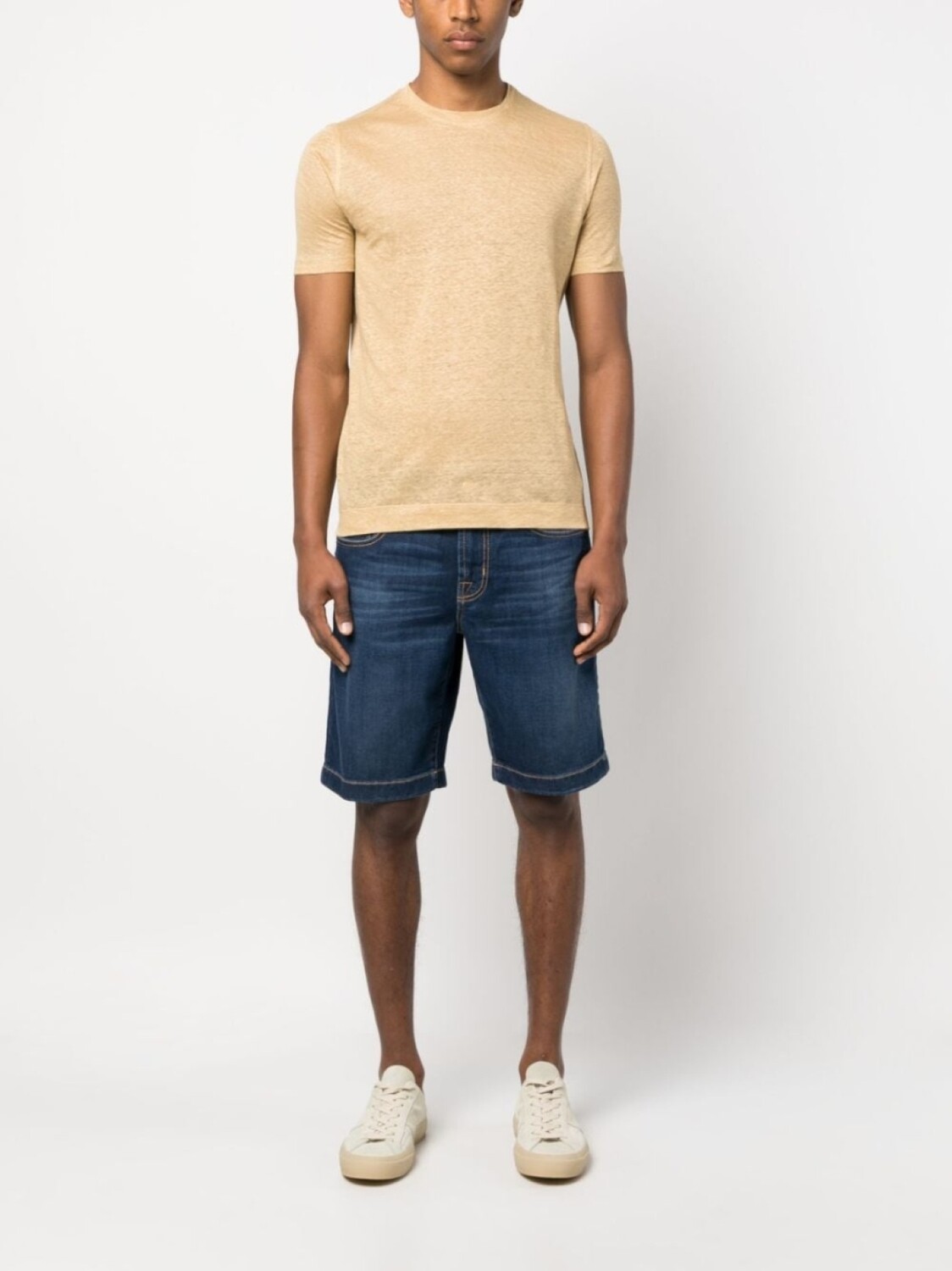 Деним, эластичный хлопок, нашивка с логотипом сзади, пять карманов, петли для ремня и прямой крой.