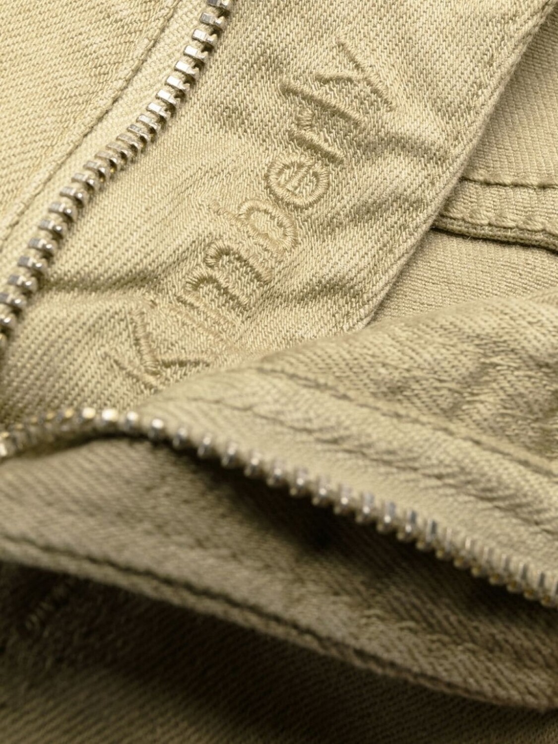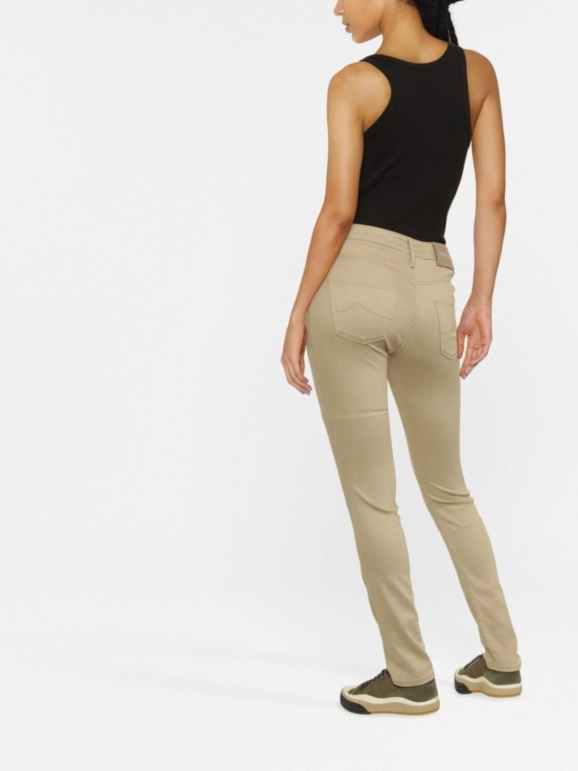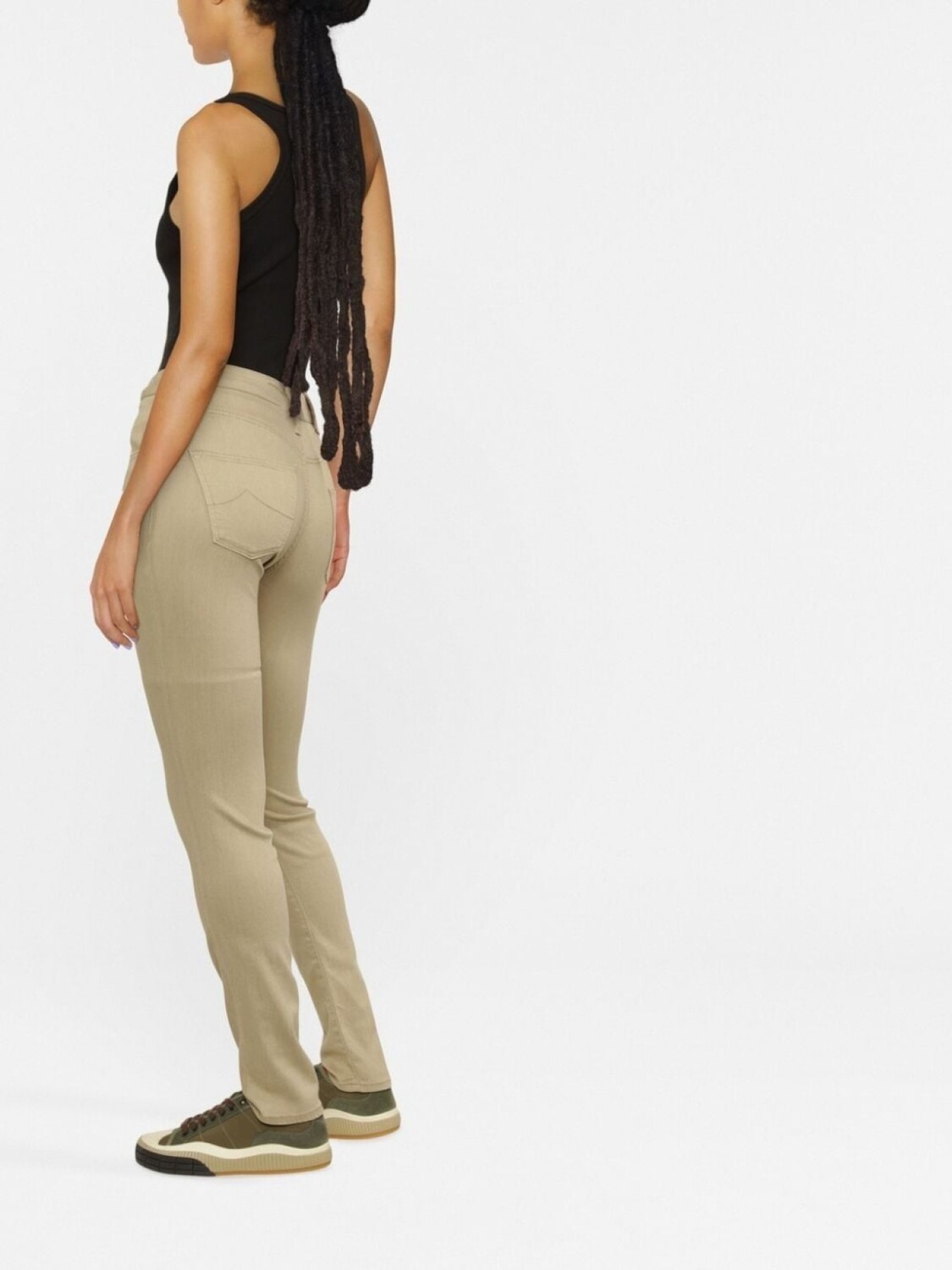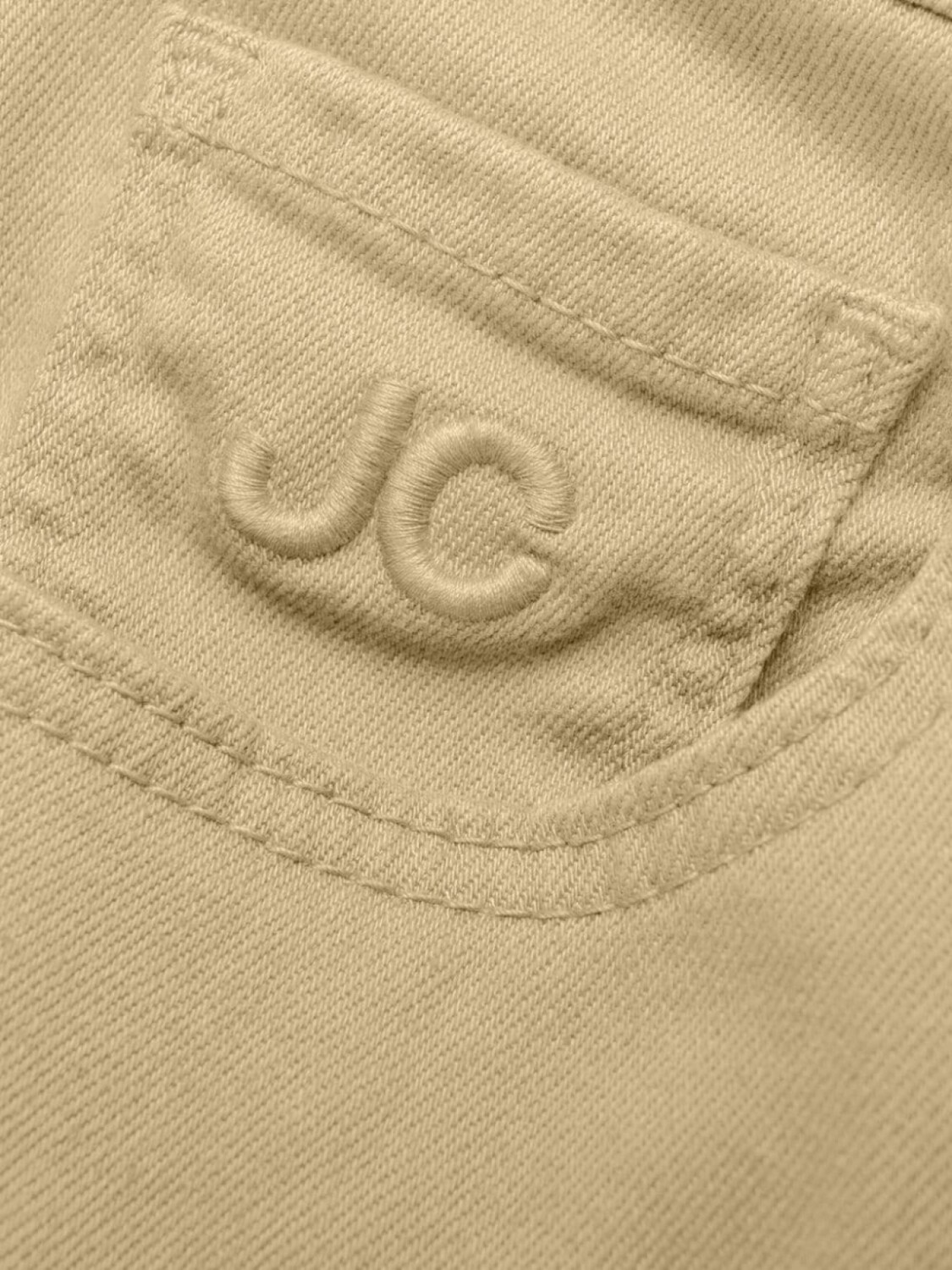 Песочно-бежевый, эластичный материал, вышитый логотип спереди, застежка на молнии и пуговице спереди, петли для ремня, нашивка с логотипом сзади, пять карманов и облегающий крой.