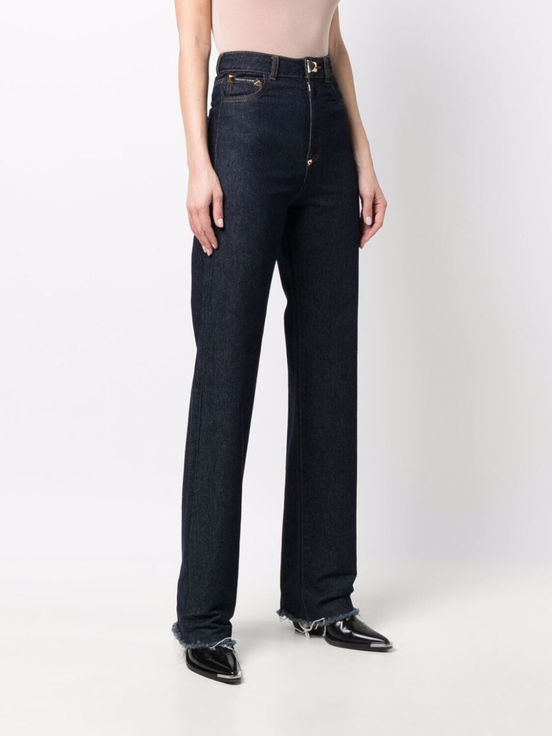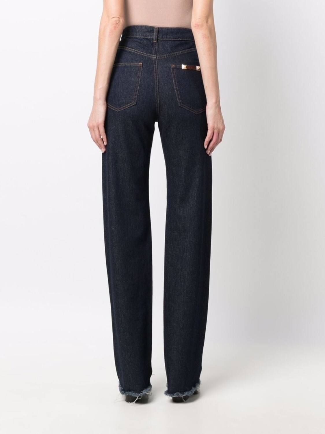 Прямой крой, завышенная талия, маленькая подвеска с логотипом, золотистые заклепки, необработанные края, потайная застежка на молнии и пуговицах, петли для ремня и классическая пятикарманная модель.