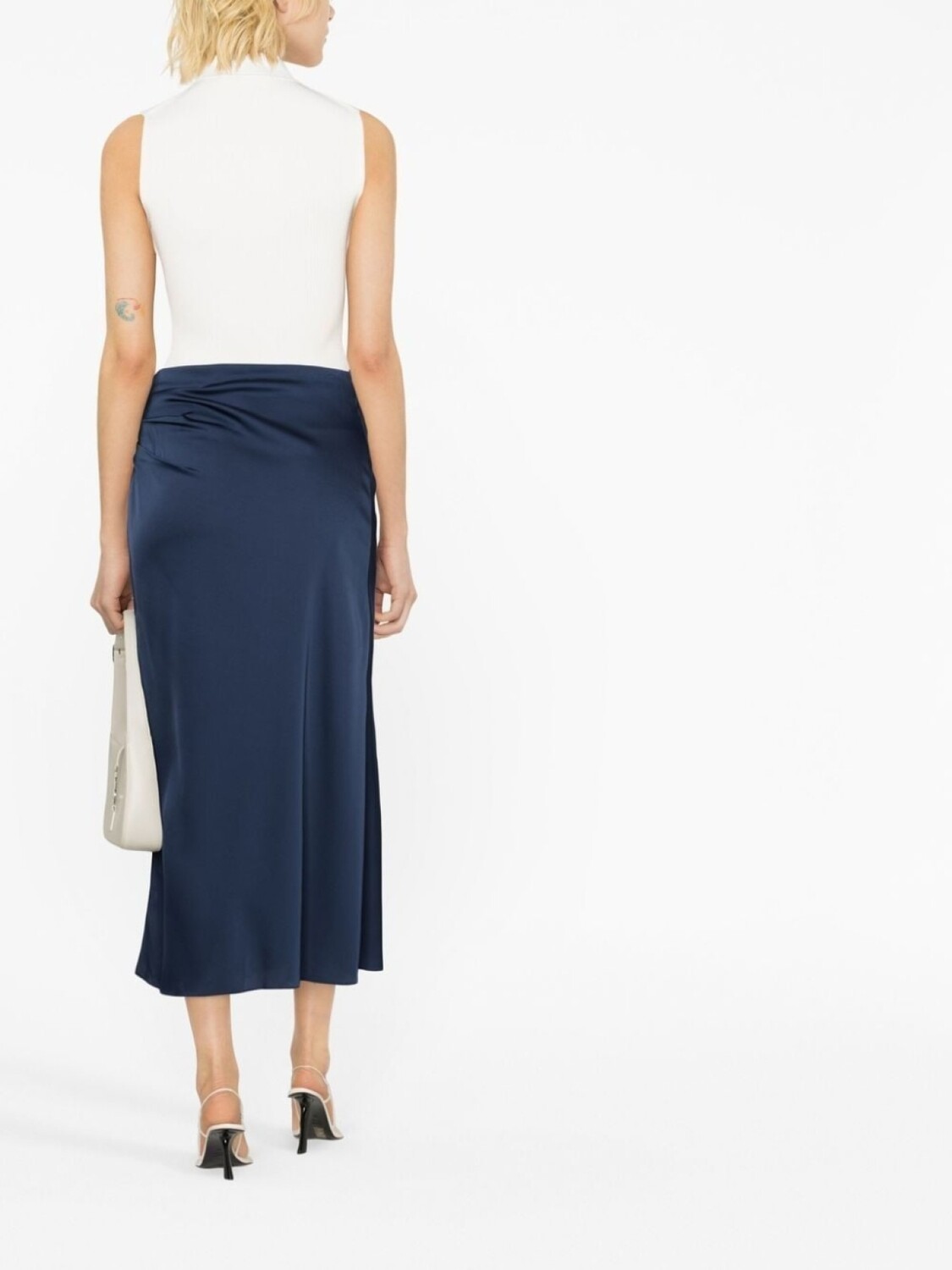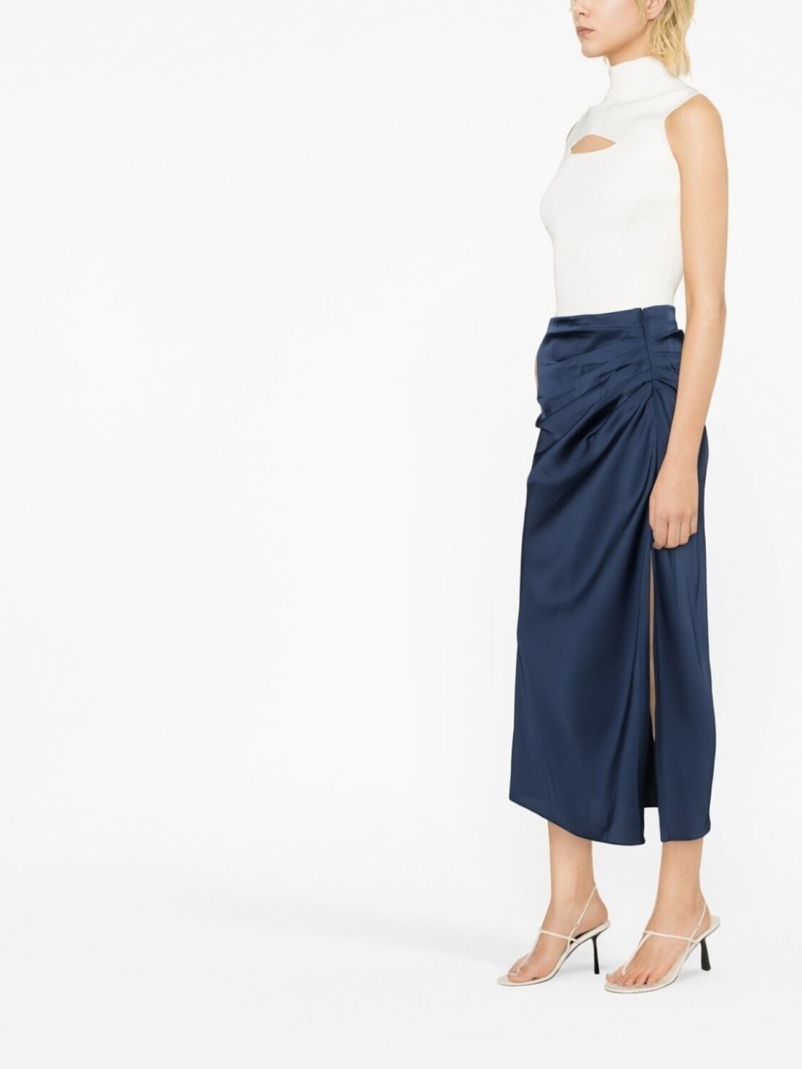 Цвет слоновой кости, трикотаж в рубчик, вырезные детали, высокий воротник, без рукавов и прямой подол.