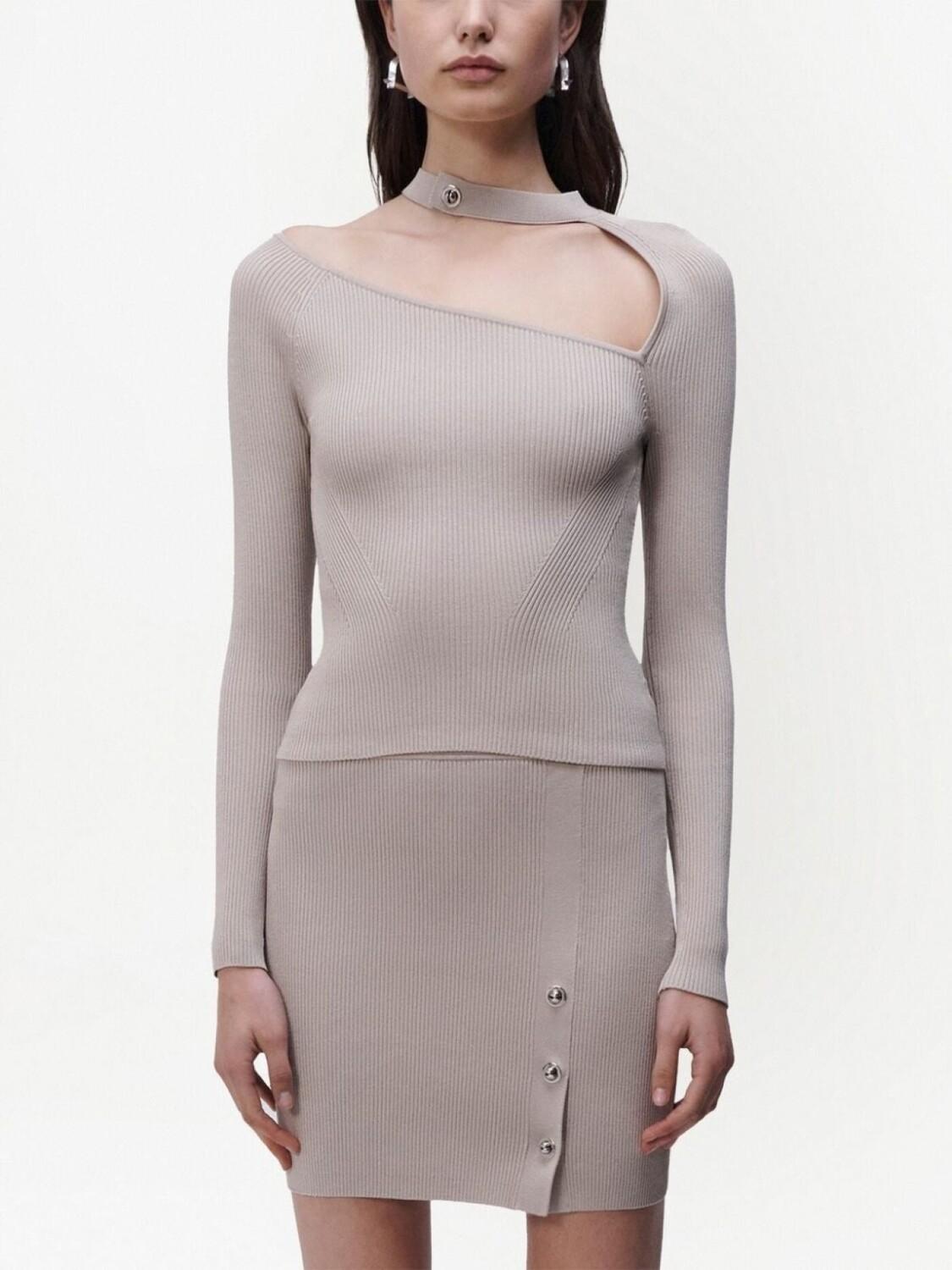 Миндальный, эластичный материал, трикотаж в рубчик, вырезные детали, застежка на кнопках, длинные рукава и прямой подол.