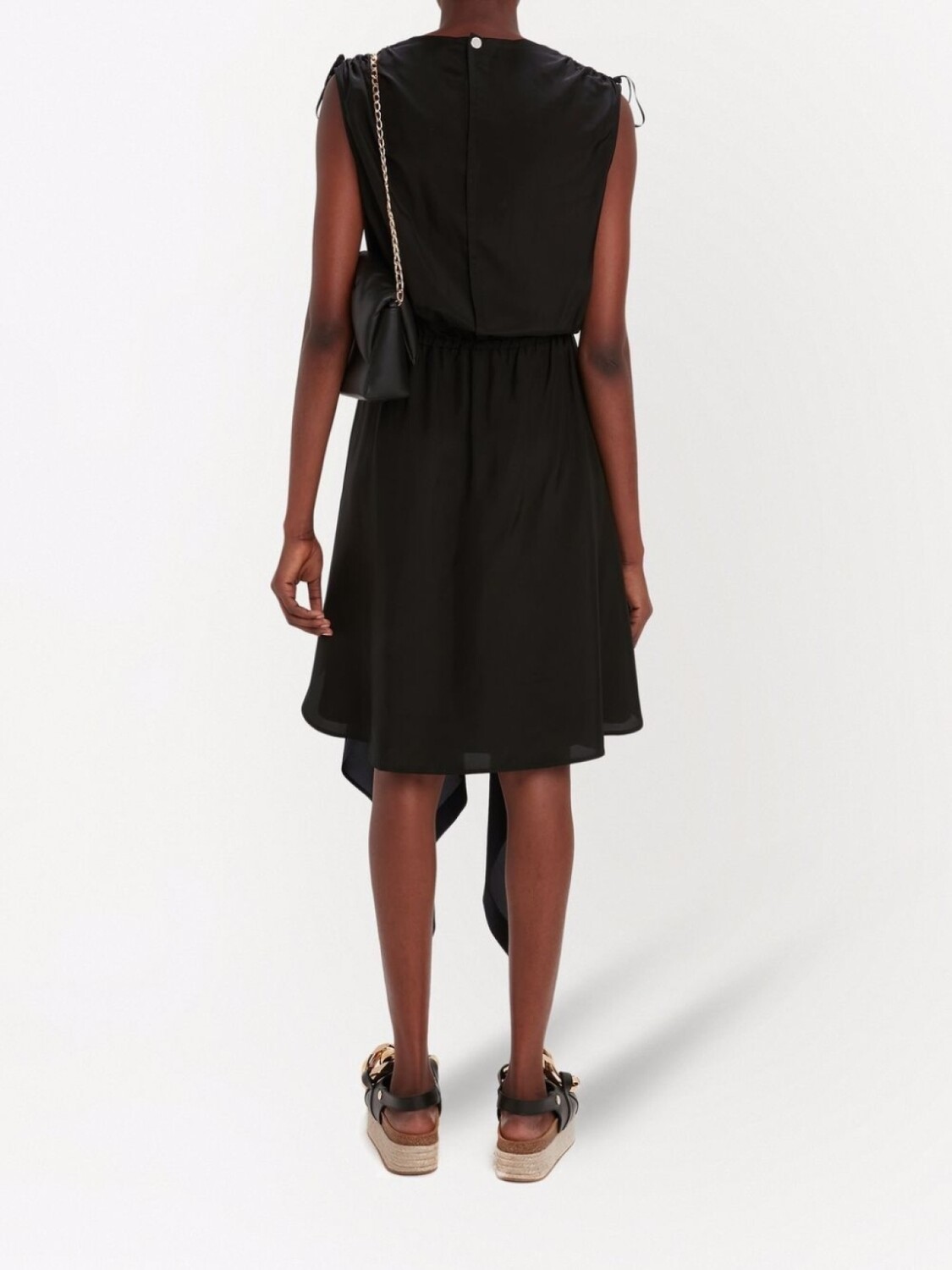 Ткань с сатиновым переплетением, круглый вырез, без рукавов, завязка на шнурке и асимметричный подол.