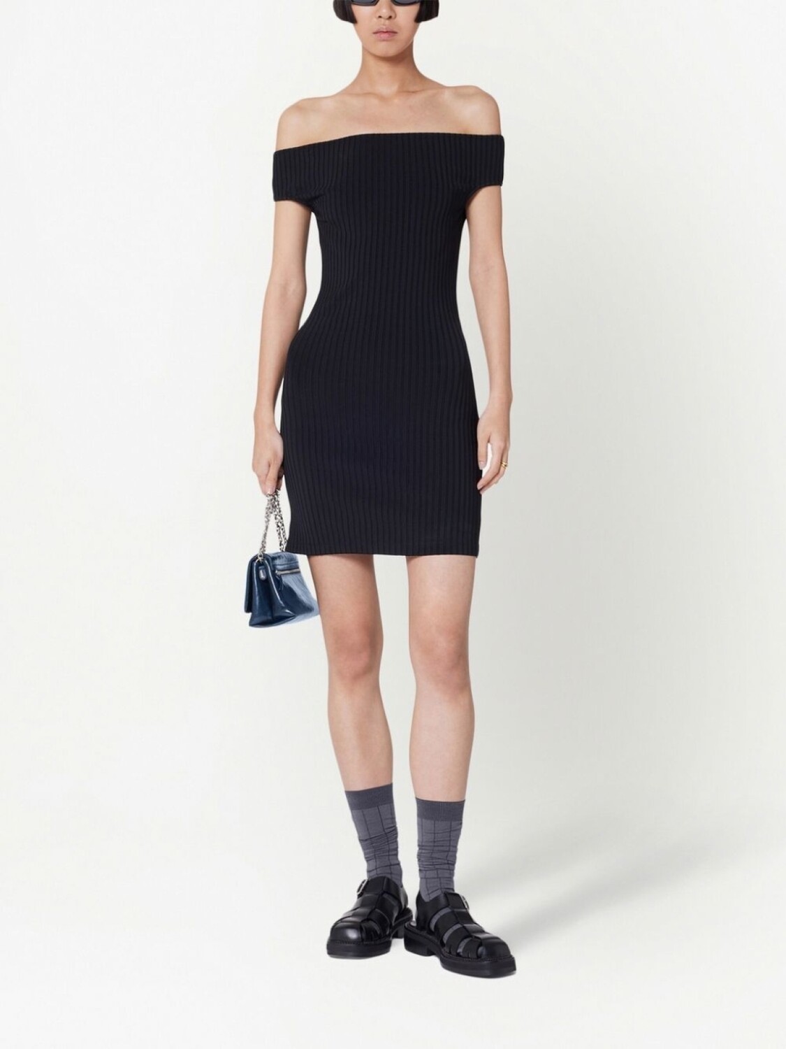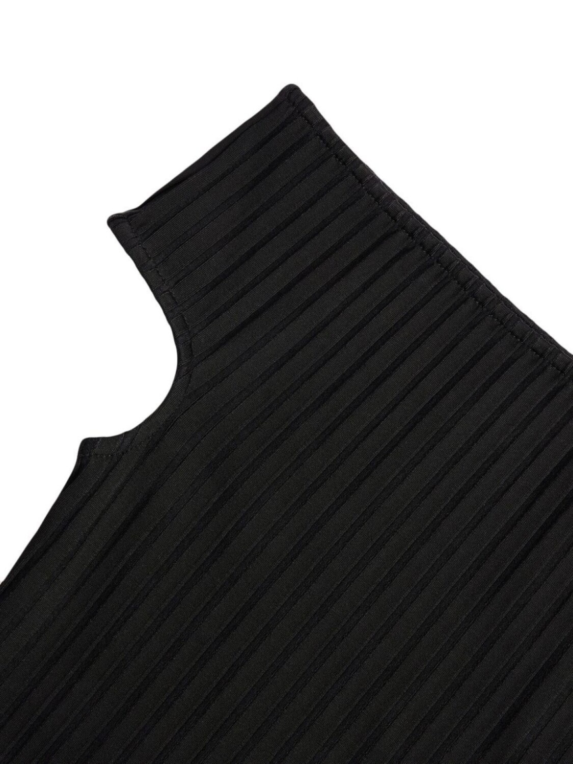 Черный, эластичный материал, трикотаж в рубчик, открытые плечи, прямой подол и высота до линии бедра.