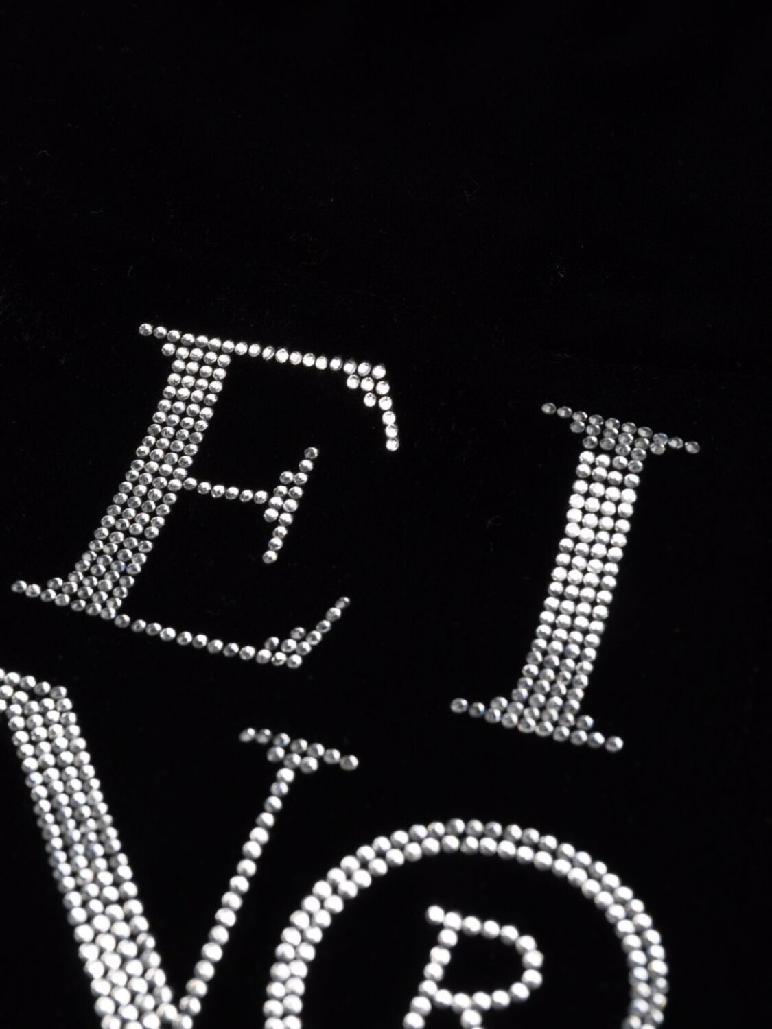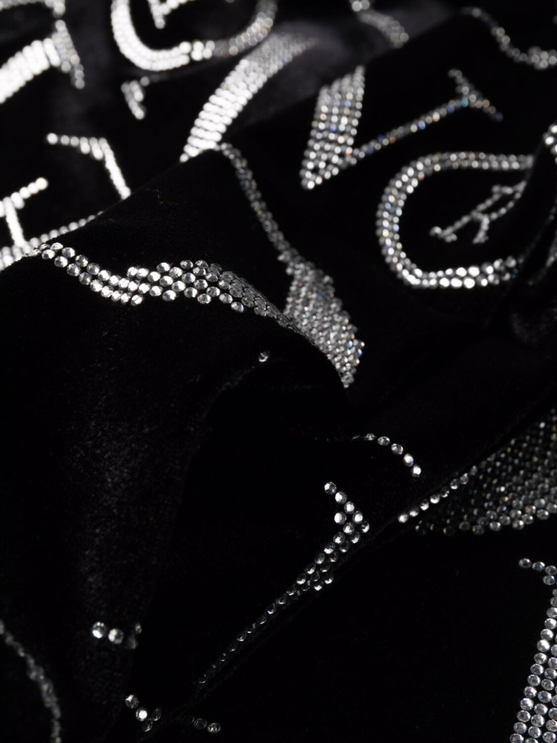 Бархатный эффект, блестящий материал, завышенная талия и сплошной принт с логотипом.