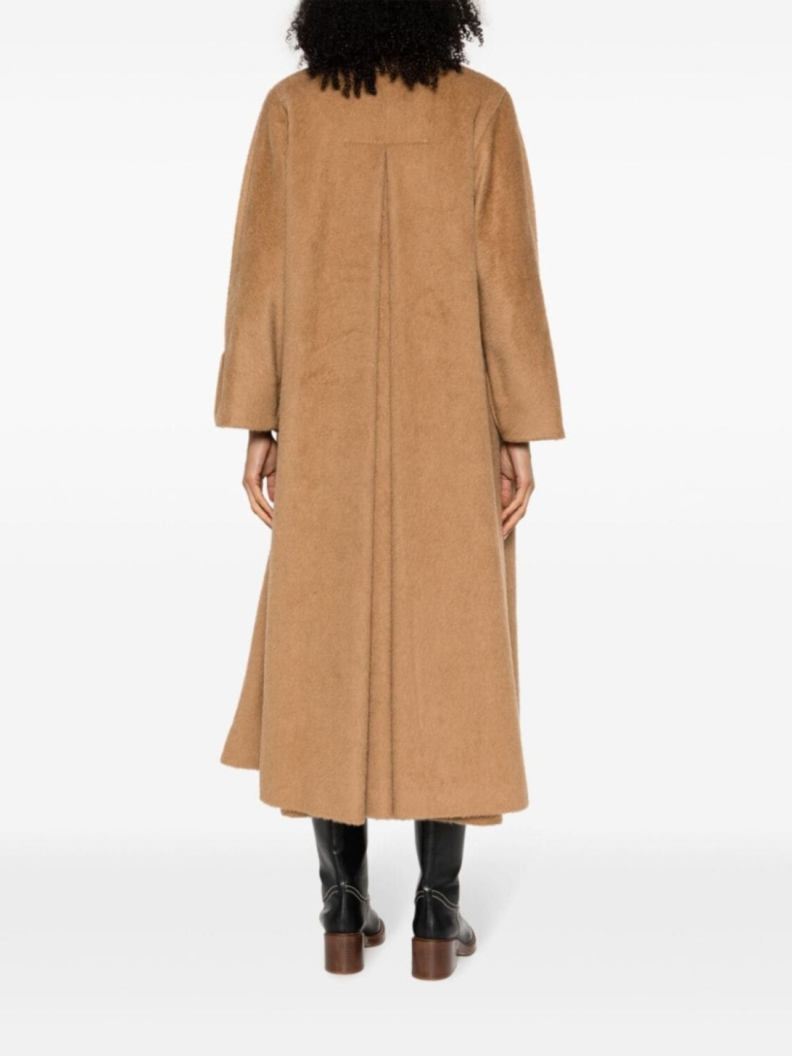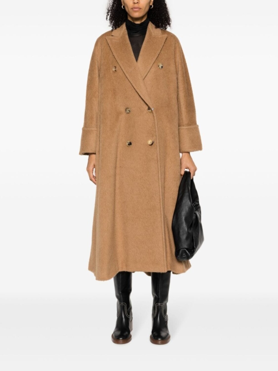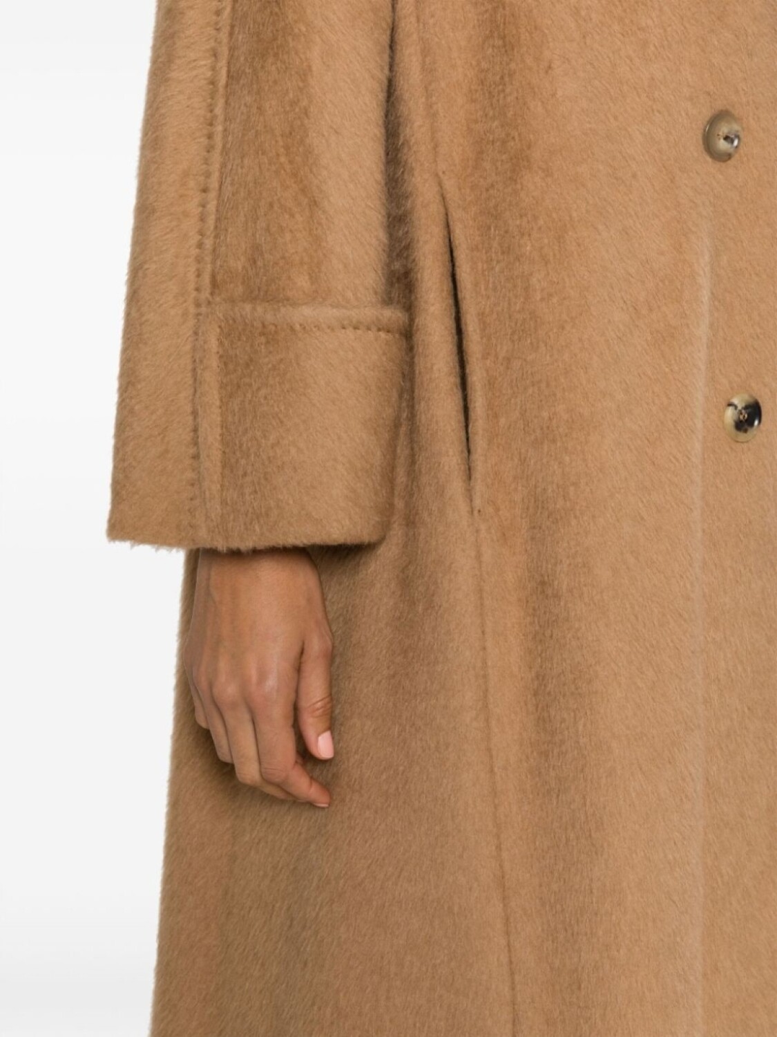 Бежево-коричневый, шерсть верблюда, заостренные лацканы, двубортная застежка на кнопки, длинные рукава, подвернутые манжеты, два прорезных кармана по бокам и прямой подол.