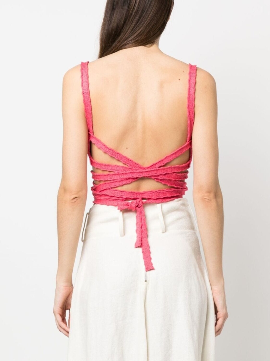 Кораллово-розовый, хлопок, трикотажный материал, ремешки, открытая спина, застежка на завязке сзади и без рукавов.