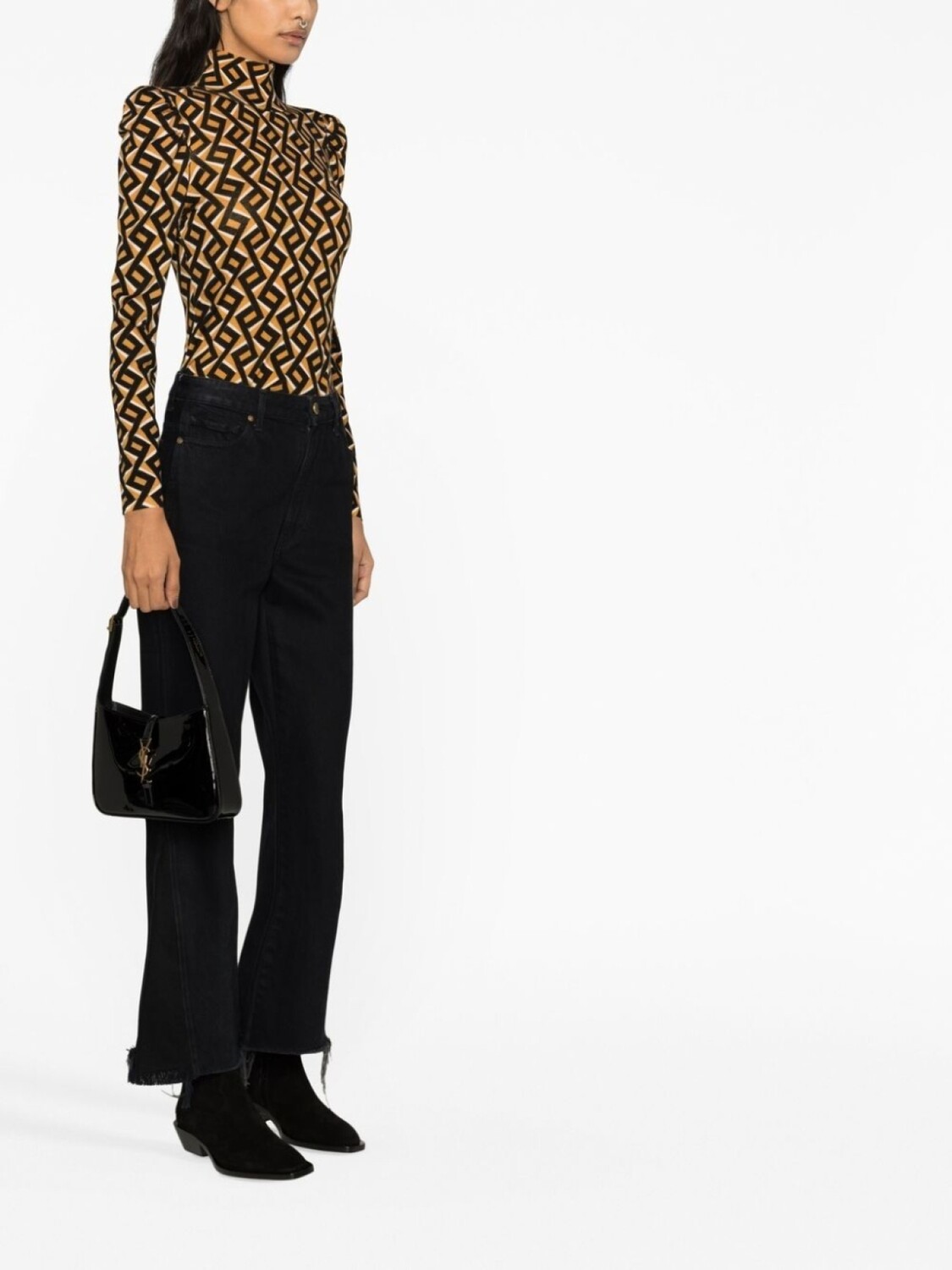 Шерсть, зигзагообразный принт, воротник-труба и объемные рукава.