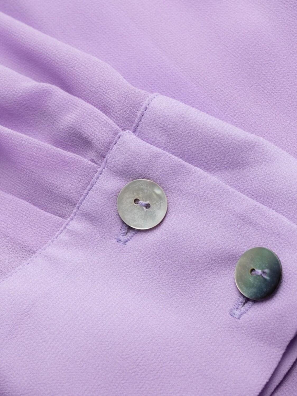 Лавандовый, полупрозрачный дизайн, закругленный воротник, потайная пуговичная застежка спереди, длинные рукава, манжеты на пуговицах и закругленный подол.