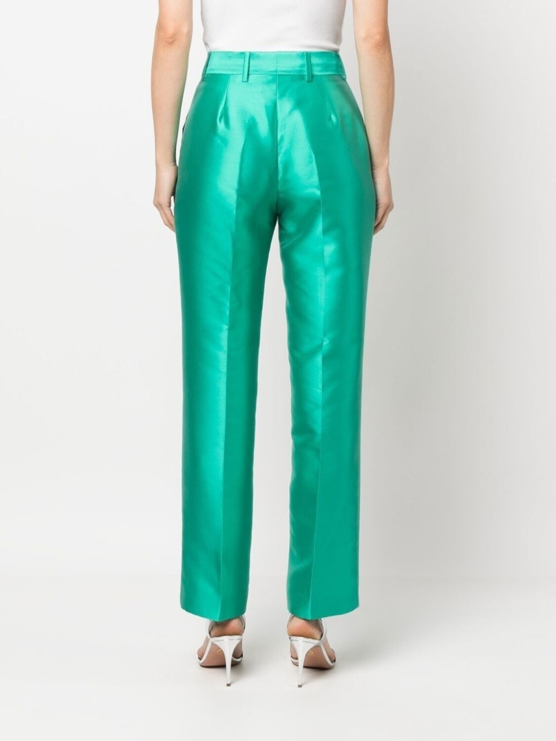 Бирюзовый, сатиновая фактура, стрелки, потайная застежка спереди, петли для ремня, завышенная талия, два кармана по бокам, прямой крой и высота по щиколотку.