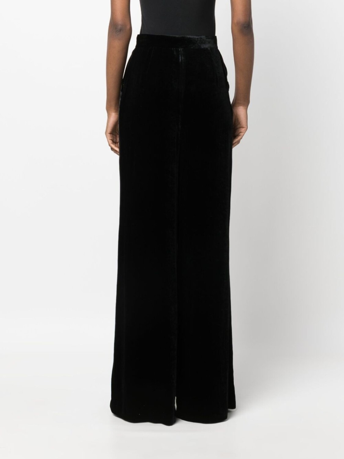 Черный, бархат, завышенная талия, потайная застежка на кнопках спереди, потайная молния спереди, застежка на крючке спереди, широкий крой, складки, два прорезных кармана по бокам, защипы и длина макси.