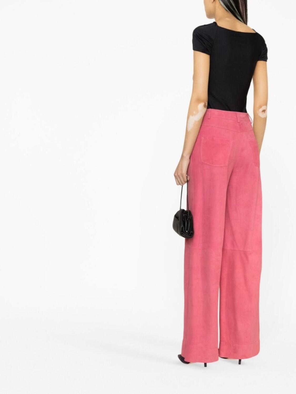 Бледно-розовый, овечья кожа, крой палаццо, завышенная талия, потайная пуговичная застежка спереди, широкий крой, два кармана по бокам и два накладных кармана.