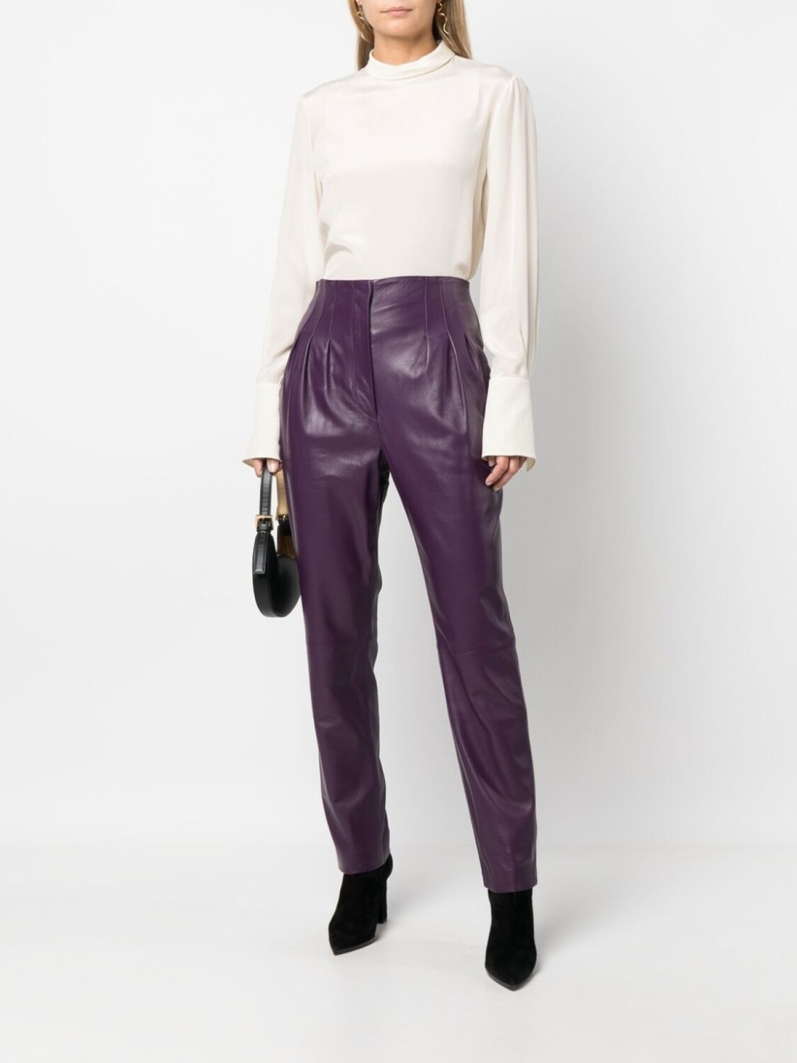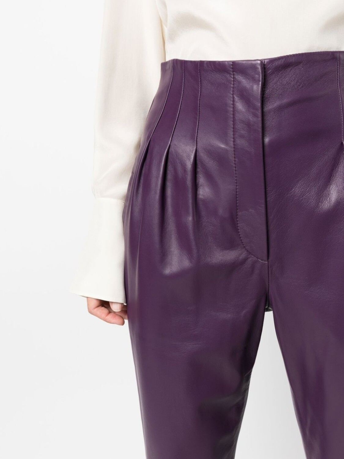Фиолетовый, овечья кожа, зауженный крой, завышенная талия, потайная застежка спереди, петли для ремня и складки.