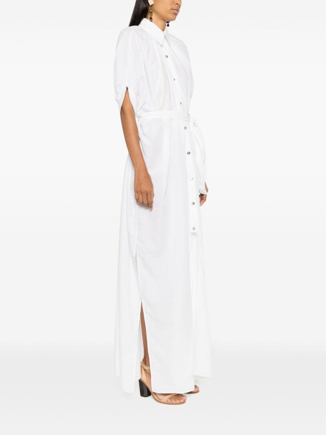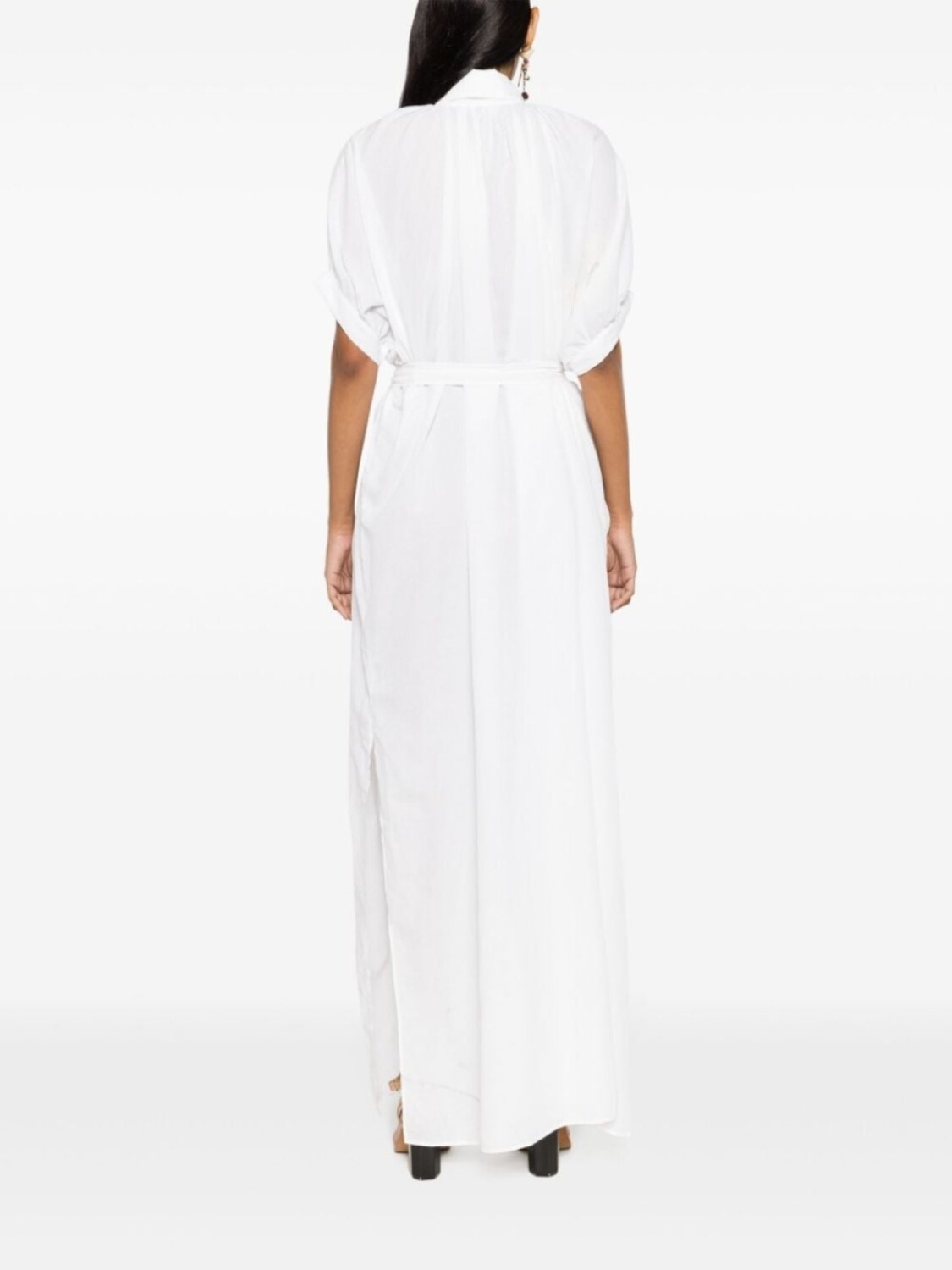Белый, прямой воротник, застежка на пуговицах спереди, складки, рукава по локоть, кулиска на талии, длина по щиколотку, прямой подол