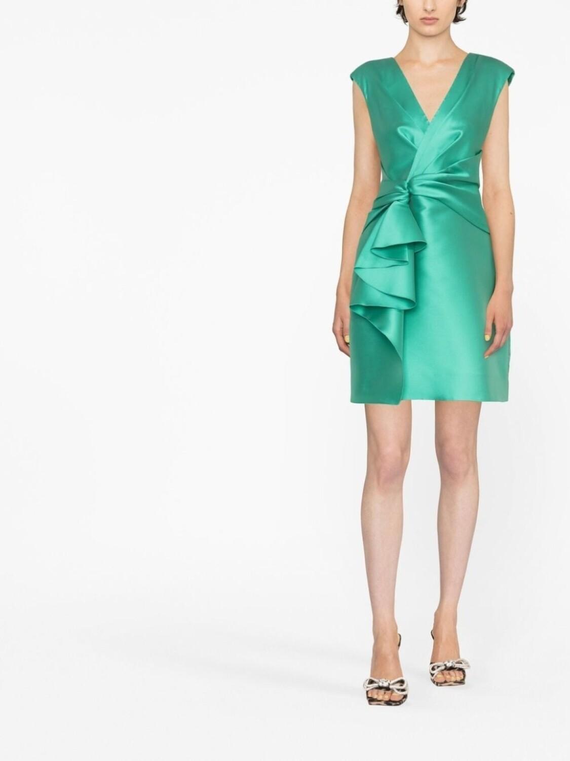 Изумрудно-зеленый, V-образный вырез, без рукавов, вогнутые детали и юбка А-образного силуэта.
