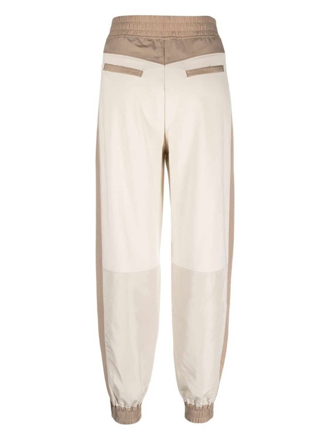 Песочно-бежевый, кремово-белый, эластичный материал, ткань джерси, вставки, эластичный пояс, застежка на кнопках, два вшитых кармана по бокам, два кармана с листочкой сзади, прямой крой и эластичные манжеты.