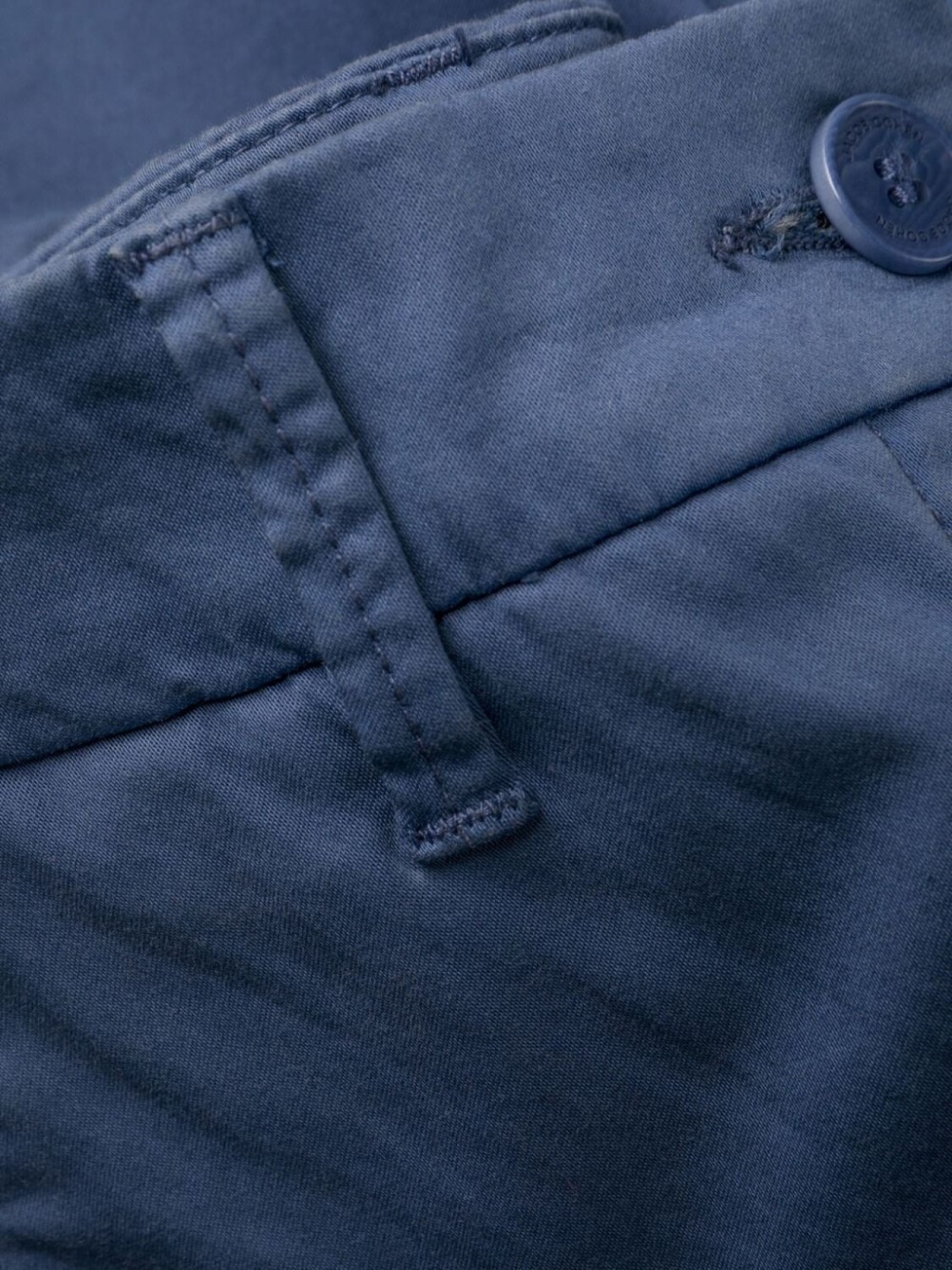 Синий, смесовый хлопок, нашивка с логотипом сзади, завышенная талия, петли для ремня, застежка на молнии и пуговице спереди, два прорезных кармана по бокам, два кармана с листочкой сзади, узкий крой и укороченная длина.