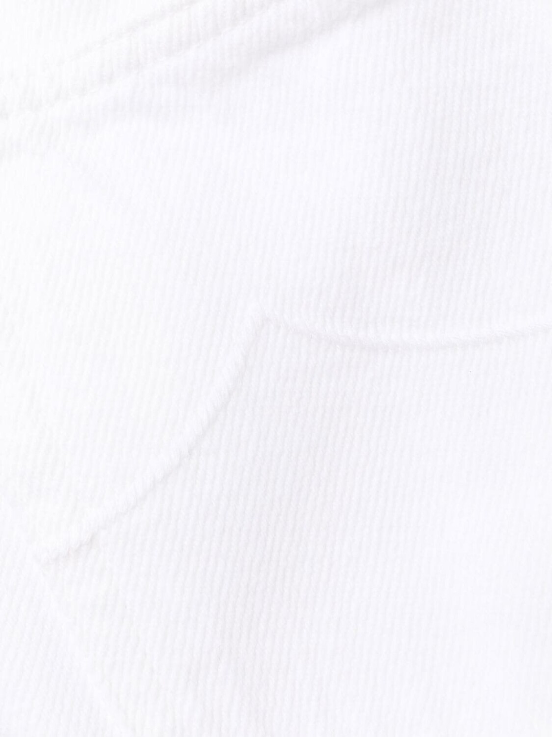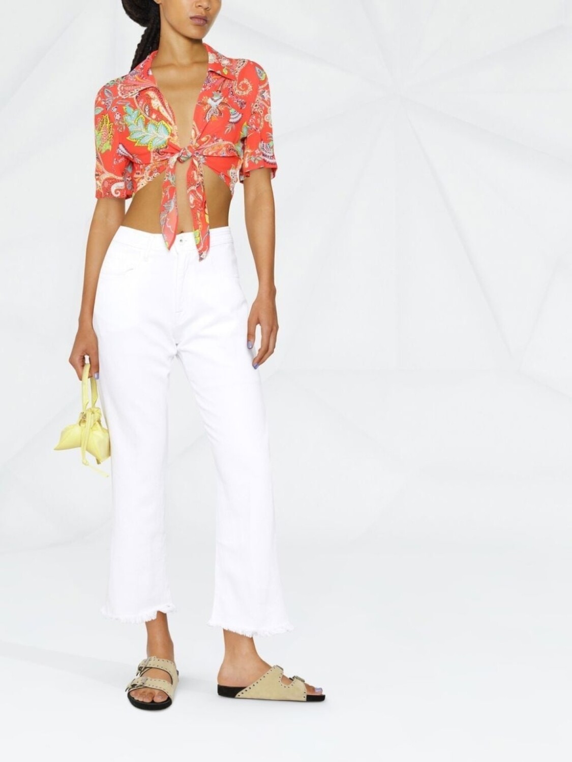 Белый, хлопок, необработанные детали, укороченная длина, средняя посадка, петли для ремня, застежка на молнии и пуговице спереди, классическая пятикарманная модель и расклешенный крой.