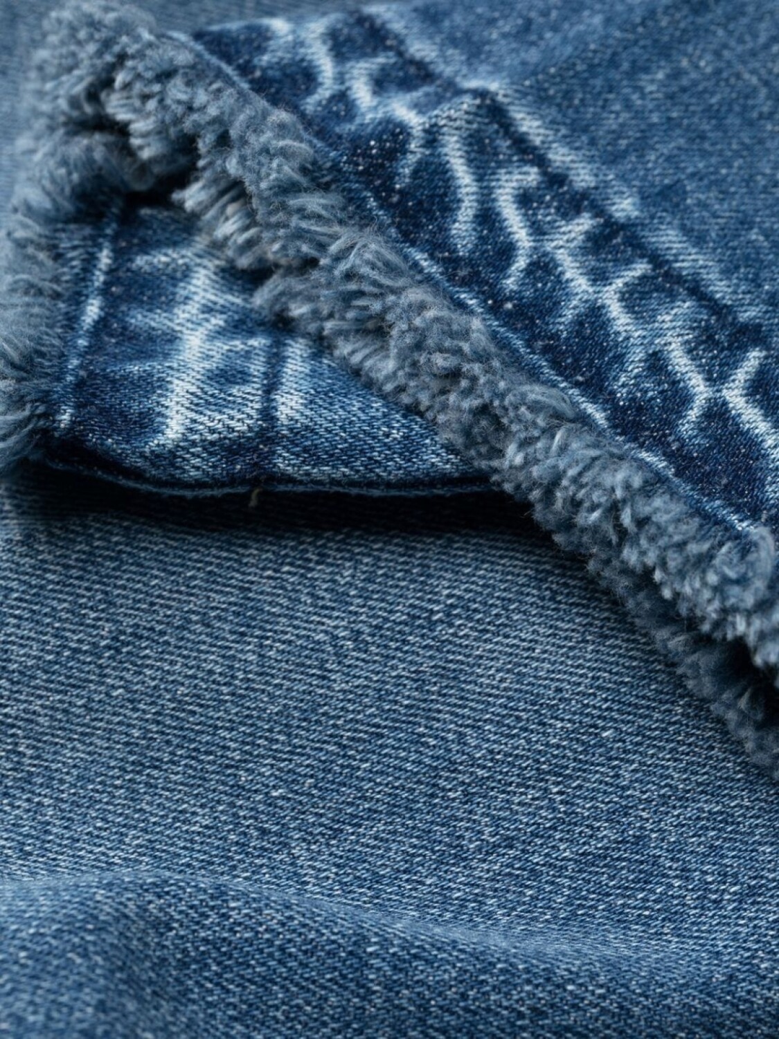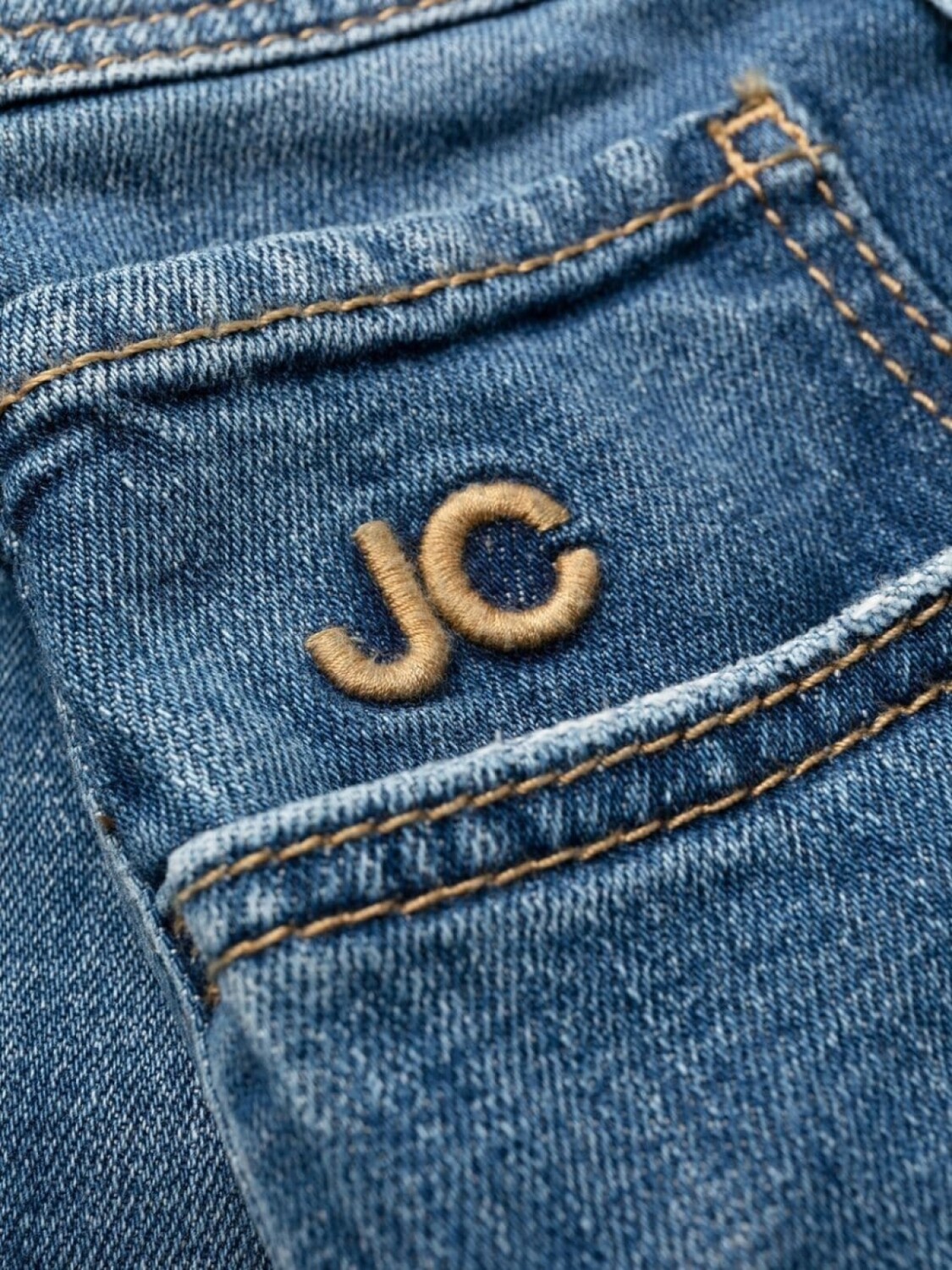 Синий, эластичный хлопок, нашивка с логотипом сзади, вышитый логотип, модель с прорезями, прямой крой, укороченная длина, завышенная талия, декоративные складки, пять карманов, потайная застежка на молнии и пуговицах и петли для ремня.