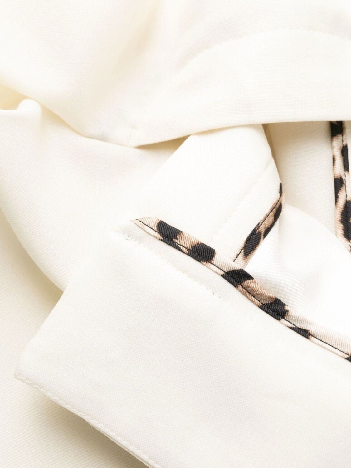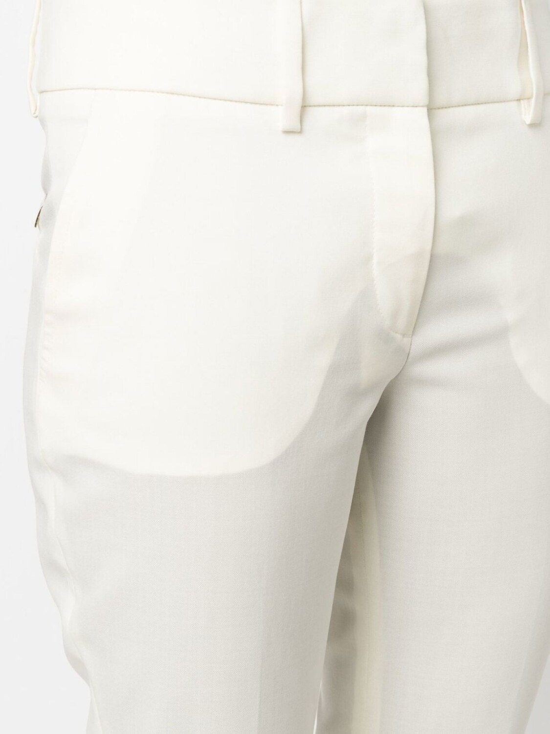 Белый, эластичная шерсть, металлический логотип, петли для ремня, потайная застежка, два прорезных кармана по бокам и два кармана с листочкой сзади.