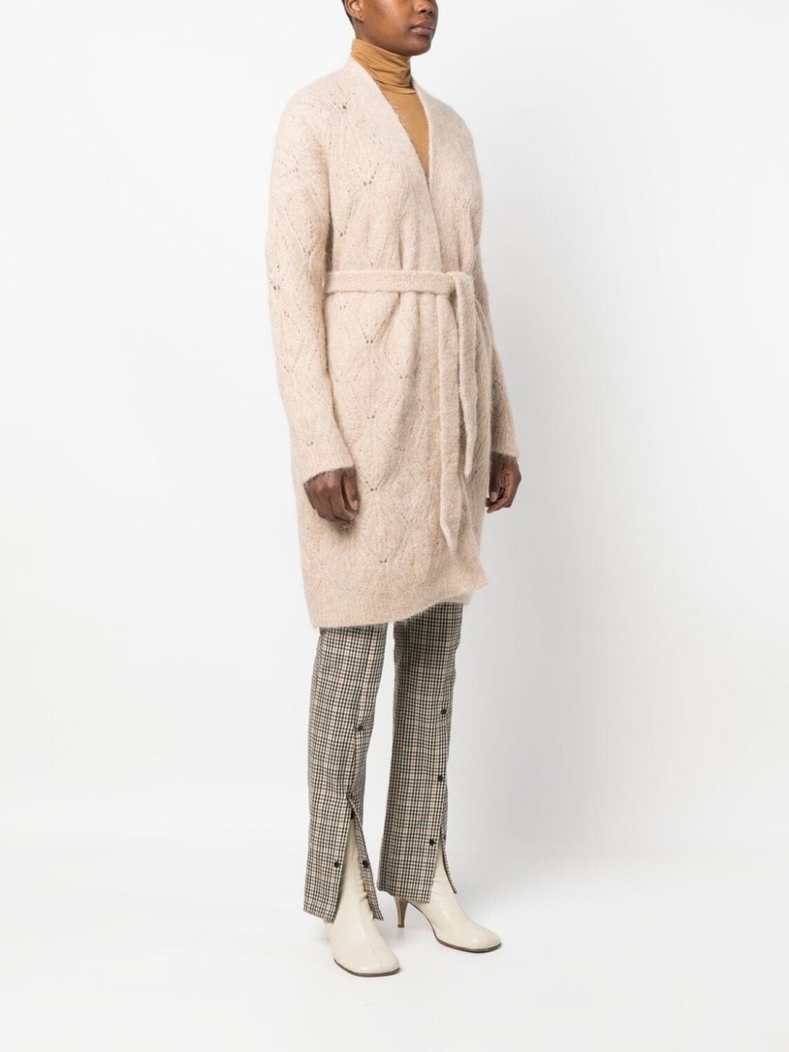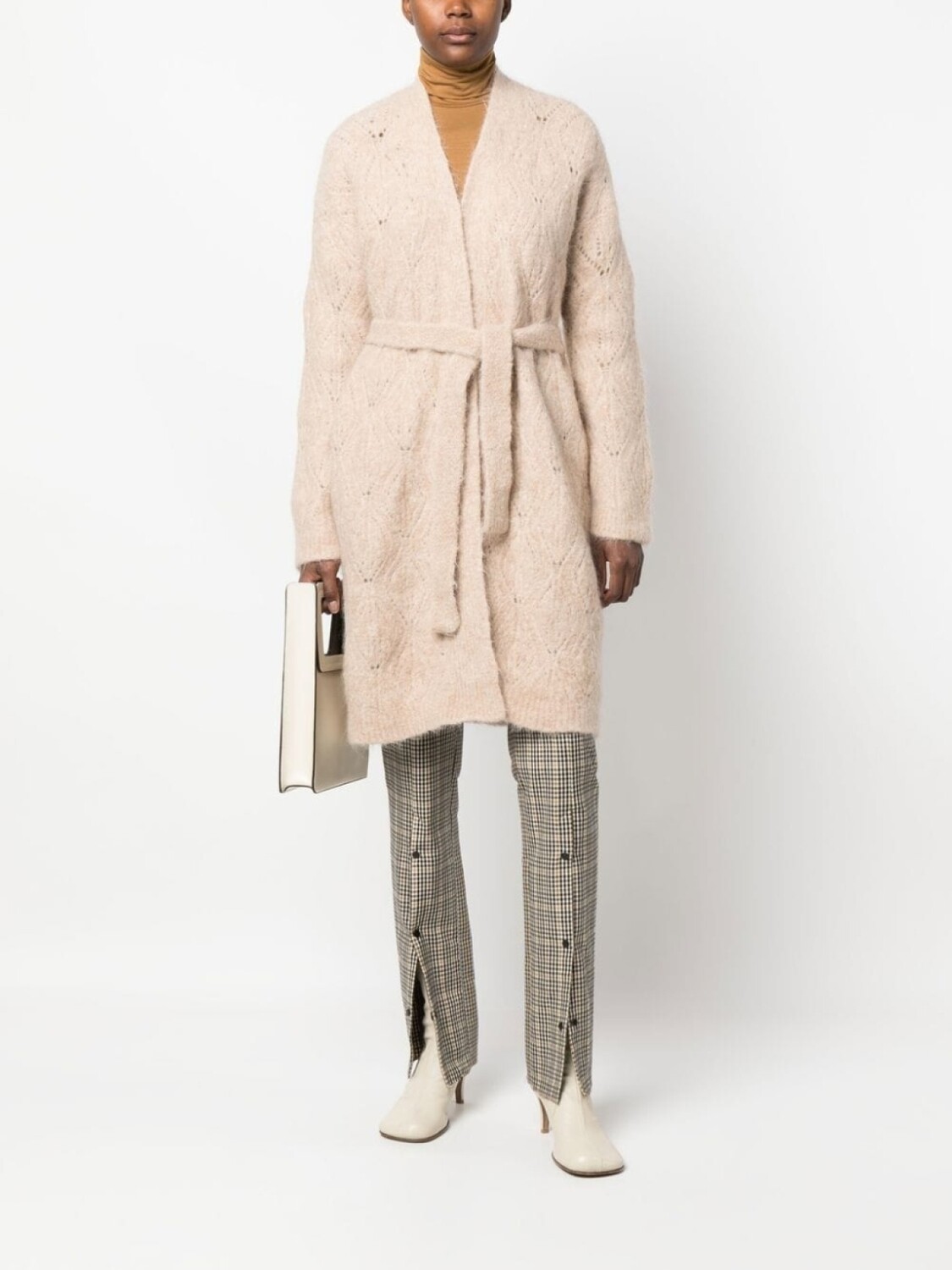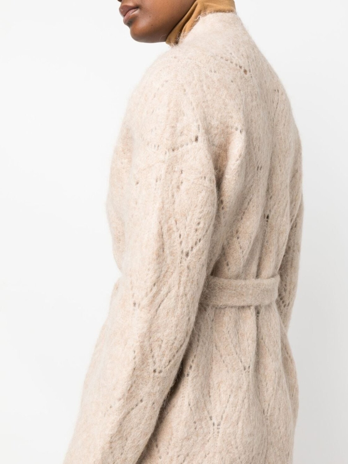 Песочно-бежевый, трикотажный материал, фактурная вязка, V-образный вырез, модель без застежки, ремень на талии, приспущенные плечи, длинные рукава и подол в рубчик.