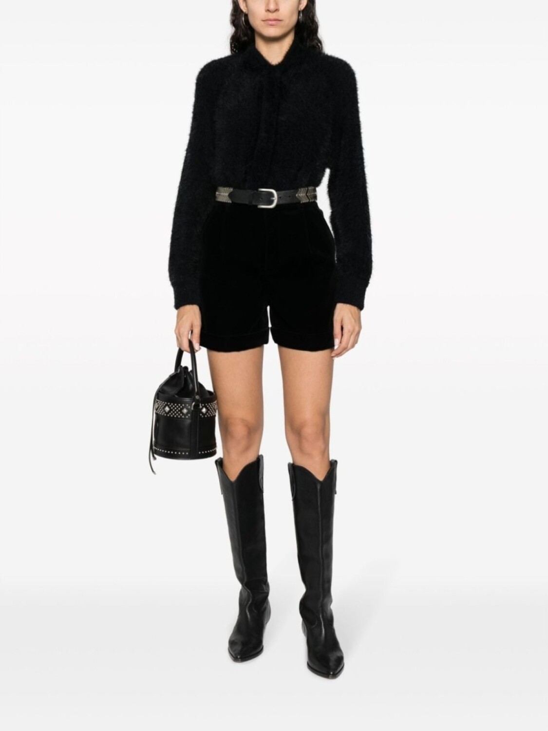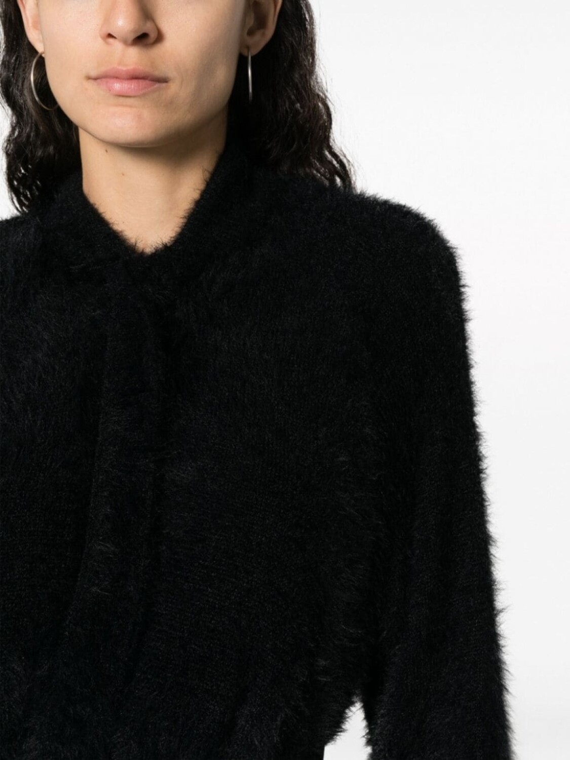 Черный, искусственный мех, матовый эффект, V-образный вырез, потайная застежка на кнопках, длинные рукава реглан, два кармана по бокам и прямой подол.
