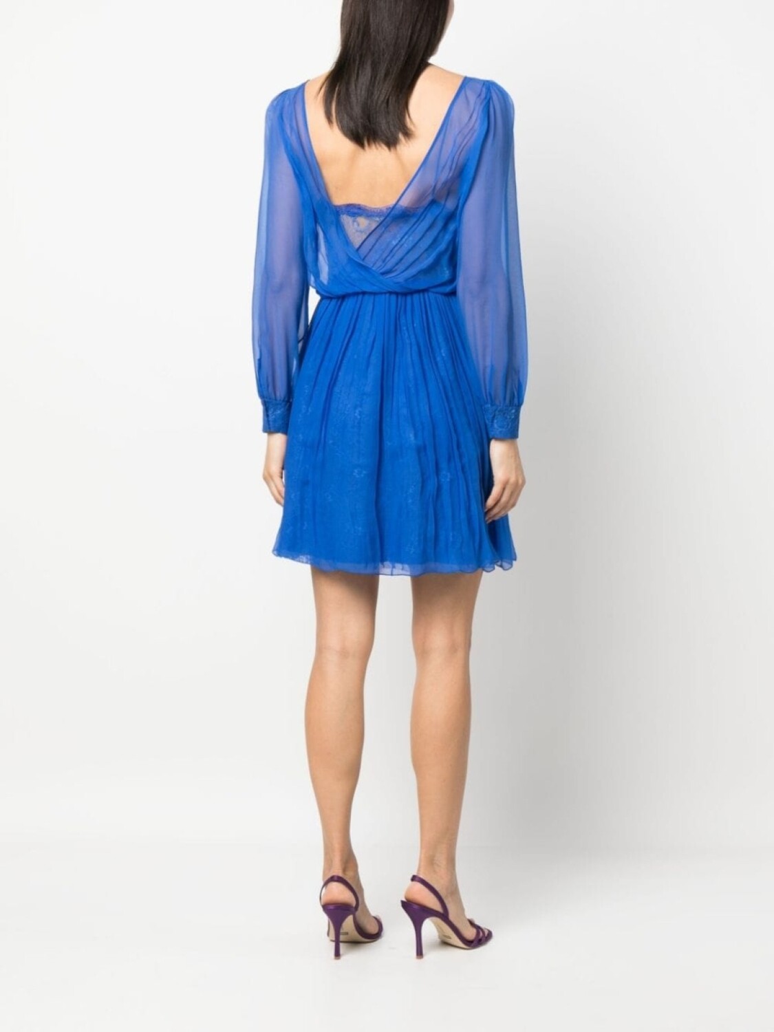 Синий, шелк, многослойный дизайн, кружевные вставки, полупрозрачный верхний слой, внутреннее платье-комбинация, V-образный вырез сзади, рукава с узкими манжетами, дизайн со сборками, расклешенная юбка и длина выше колена.