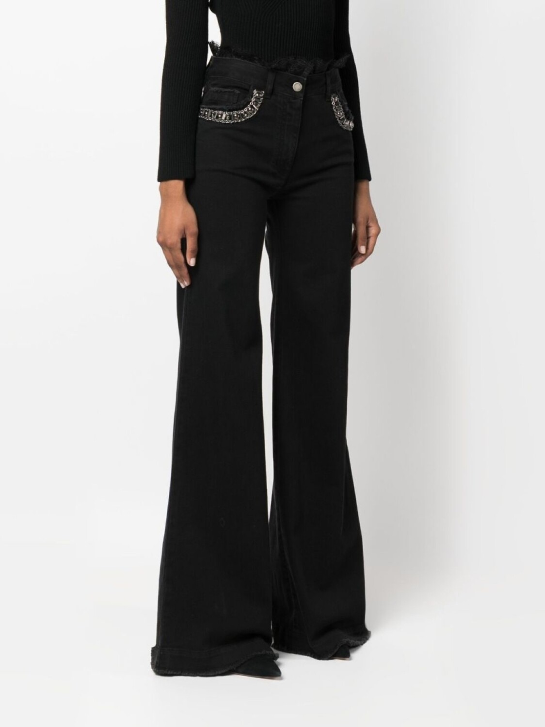 Черный, эластичный хлопок, деним, кружевная отделка, петли для ремня, цепочка, застежка на пуговицах спереди, завышенная талия, широкий крой, пять карманов и длина макси.