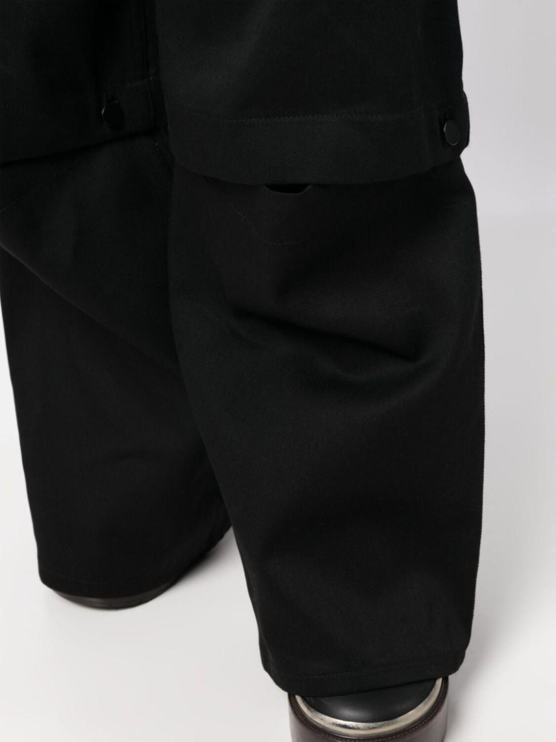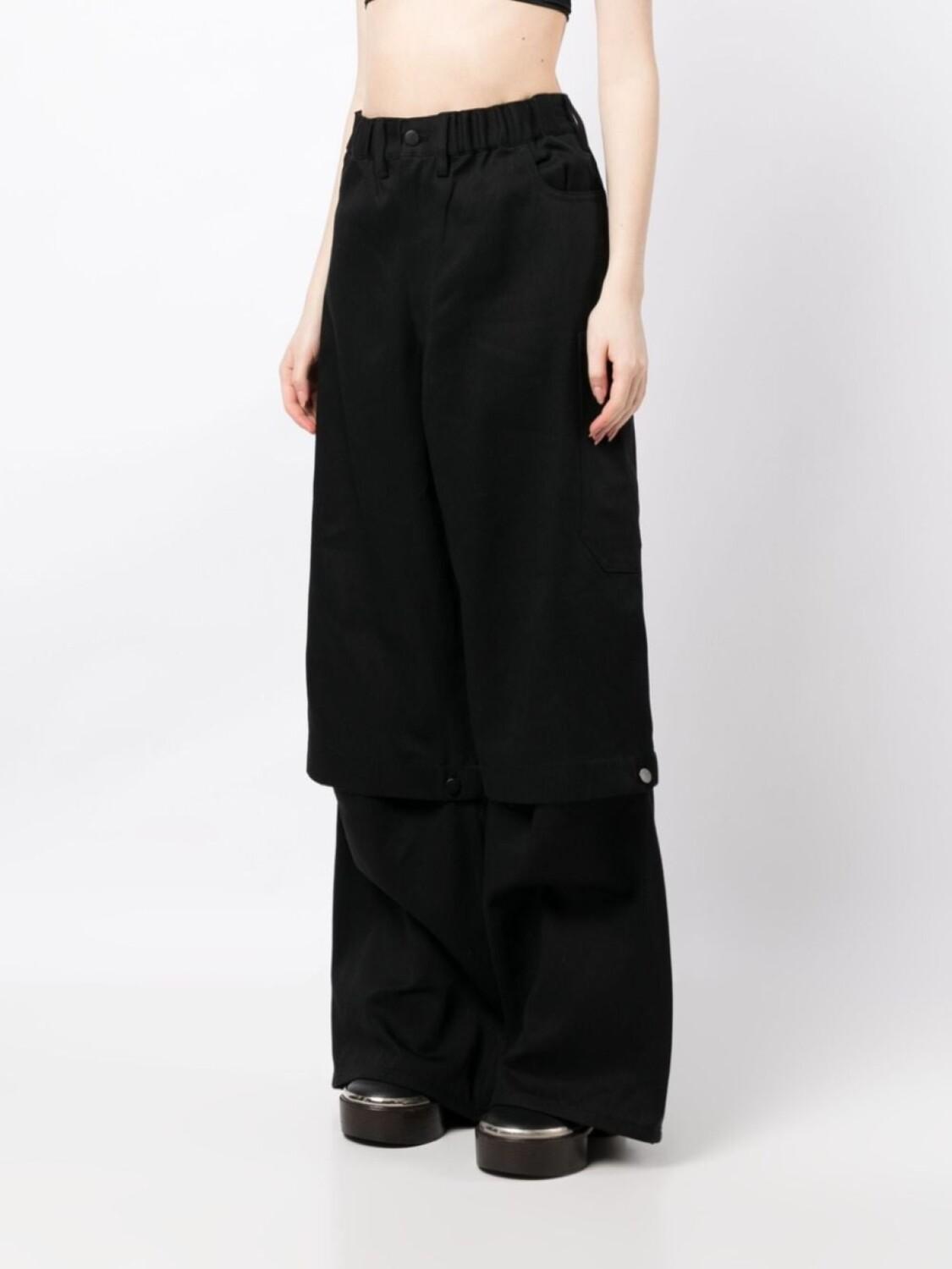 Черный, хлопок, деним, нашивка с логотипом сзади, петли для ремня, застежка на молнии и пуговице спереди, два кармана по бокам, два накладных кармана по бокам, съемные брючины, широкий крой и прямой подол.