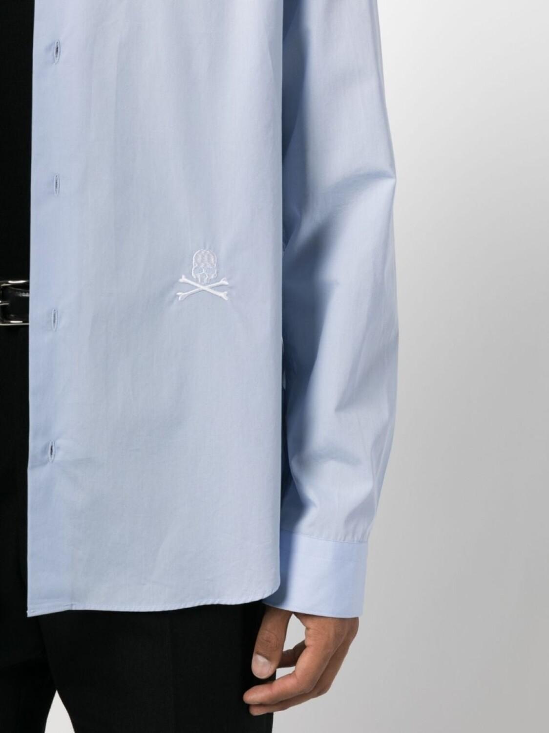 Голубой, хлопок, вышивка с изображением черепа спереди, классический воротник, застежка на пуговицах спереди, длинные рукава, манжеты на пуговицах и закругленный подол.