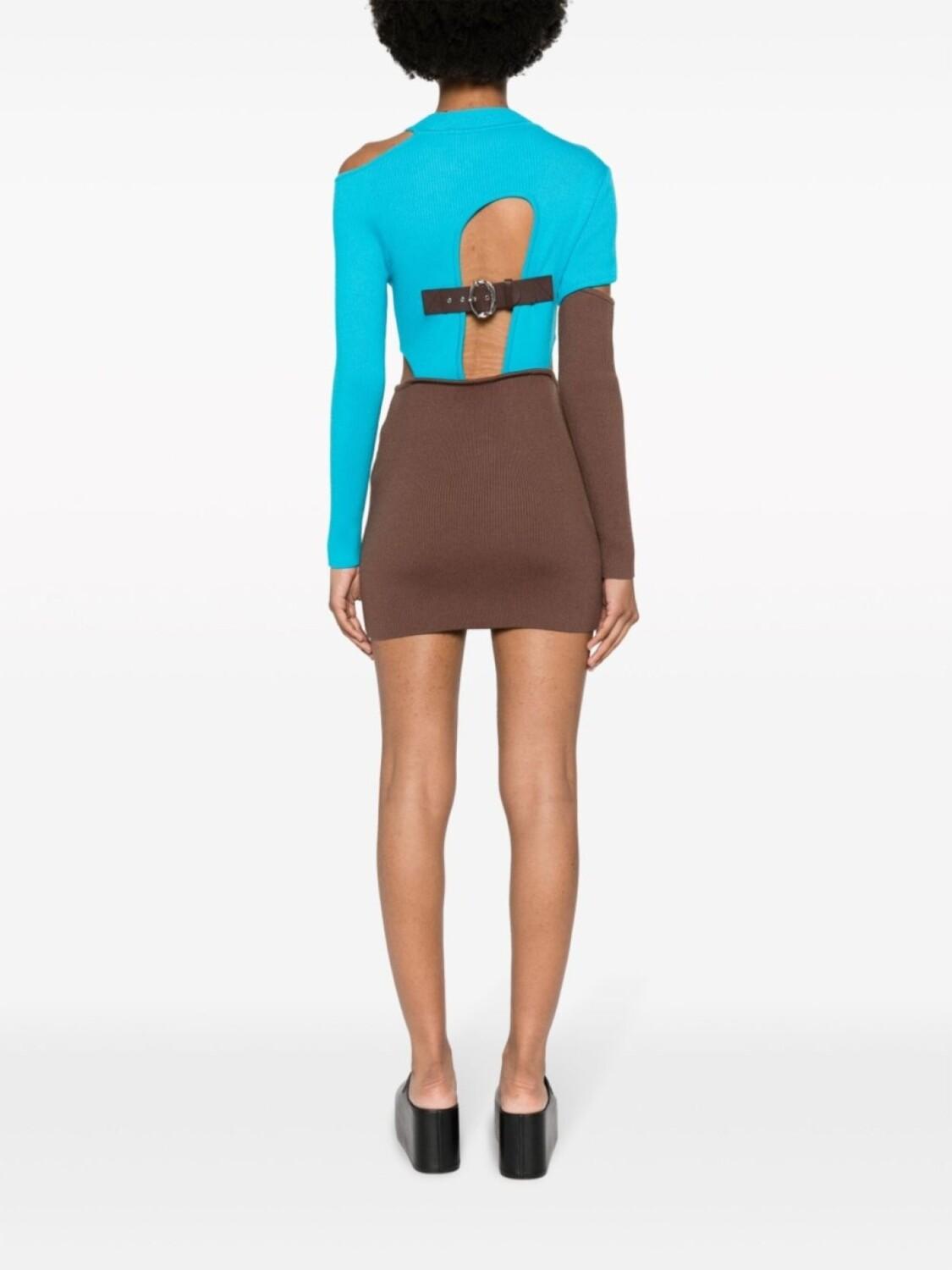 Синий, коричневый, трикотаж в рубчик, сочетание двух оттенков, вырезные детали, высокий воротник, регулируемый ремешок сзади, длинные рукава, прямой подол и высота до линии бедра.