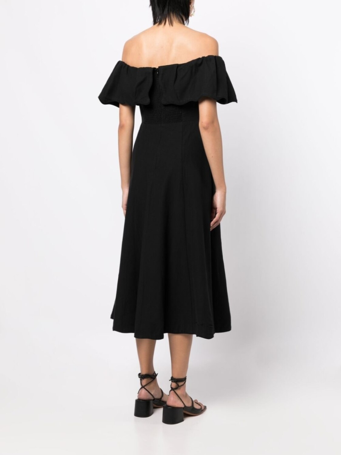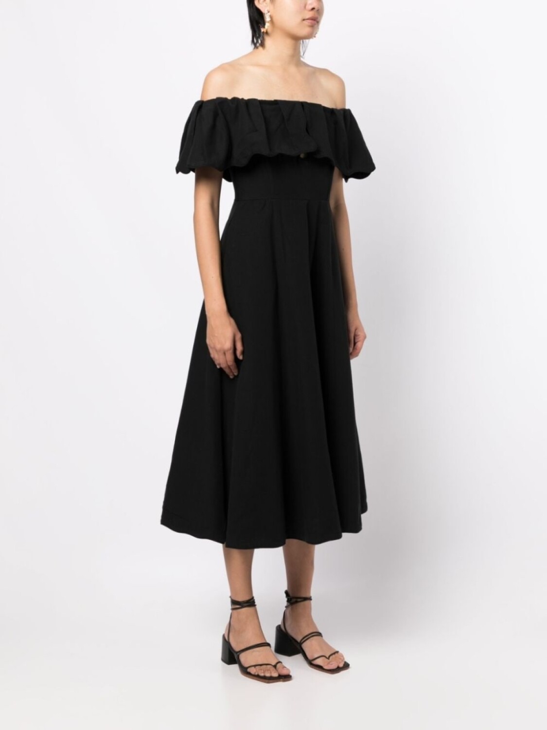 Смесовый хлопок, открытые плечи, воротник с оборками, вставка со сборками, приталенный силуэт, расклешенная юбка, застежка на молнии сзади и подол с фестонами.