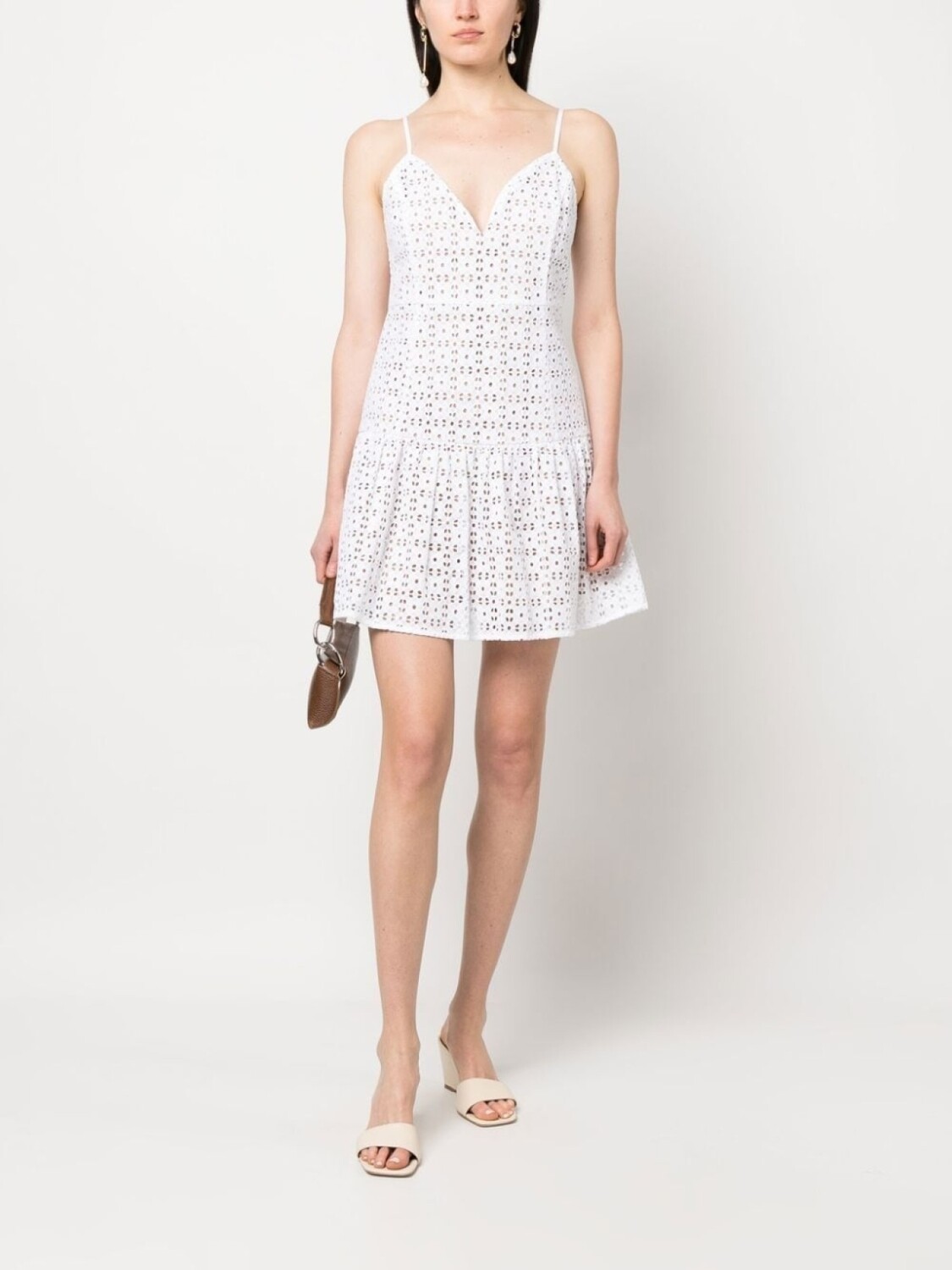 Белый, хлопок, люверсы, вырез в форме сердца, тонкие бретели, расклешенная юбка и закругленный подол.