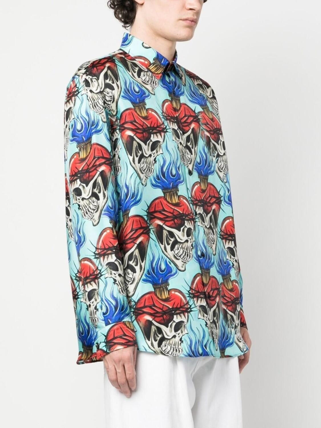 Синий, разноцветный, шелк, принт с изображением черепа, классический воротник, застежка на пуговицах спереди, длинные рукава, манжеты на пуговицах и закругленный подол.
