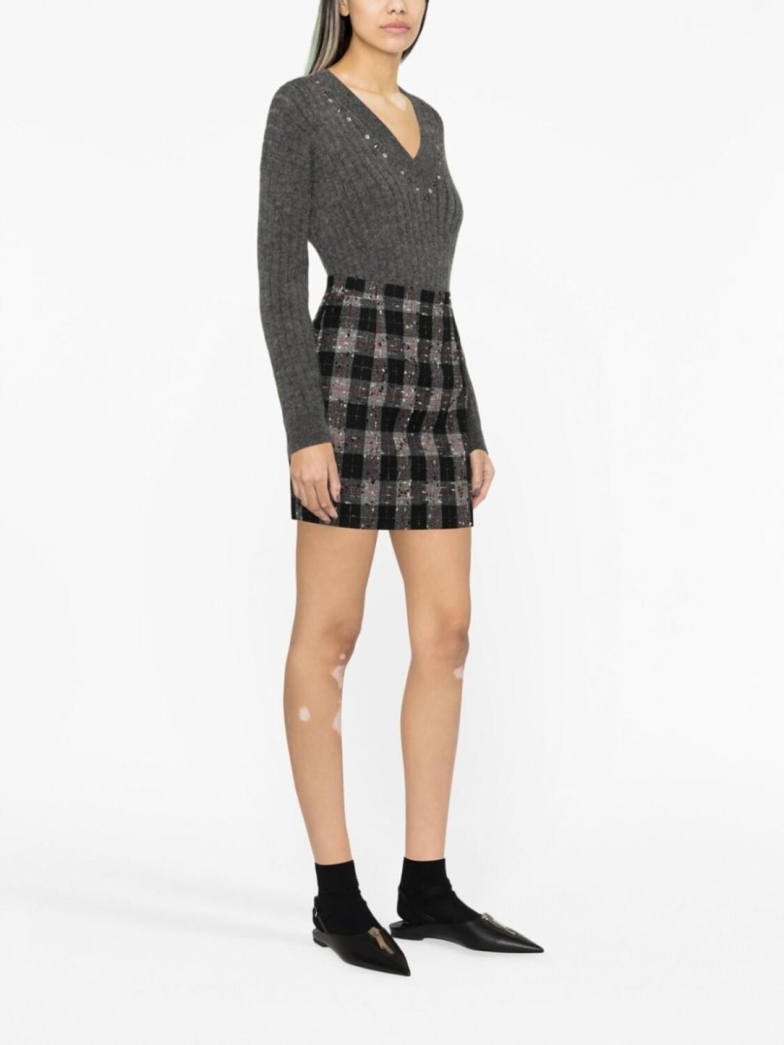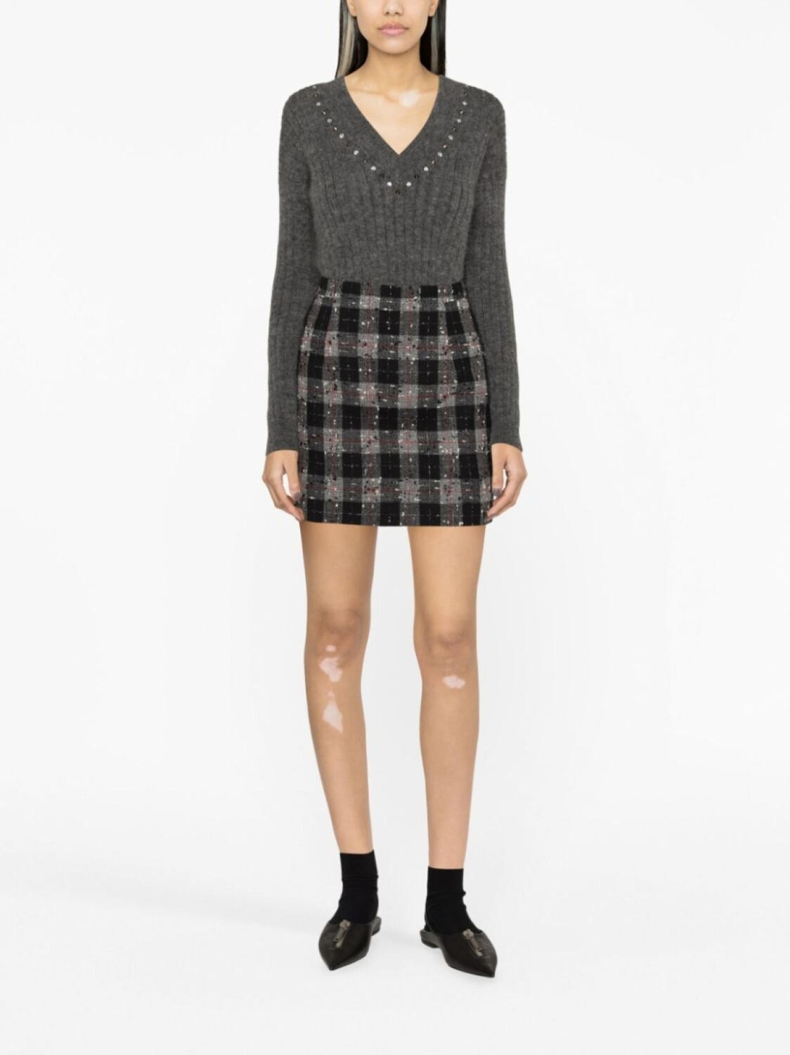 Угольно-серый, смесовая необработанная шерсть, трикотаж в рубчик, заклепки, V-образный вырез, длинные рукава и прямой подол.