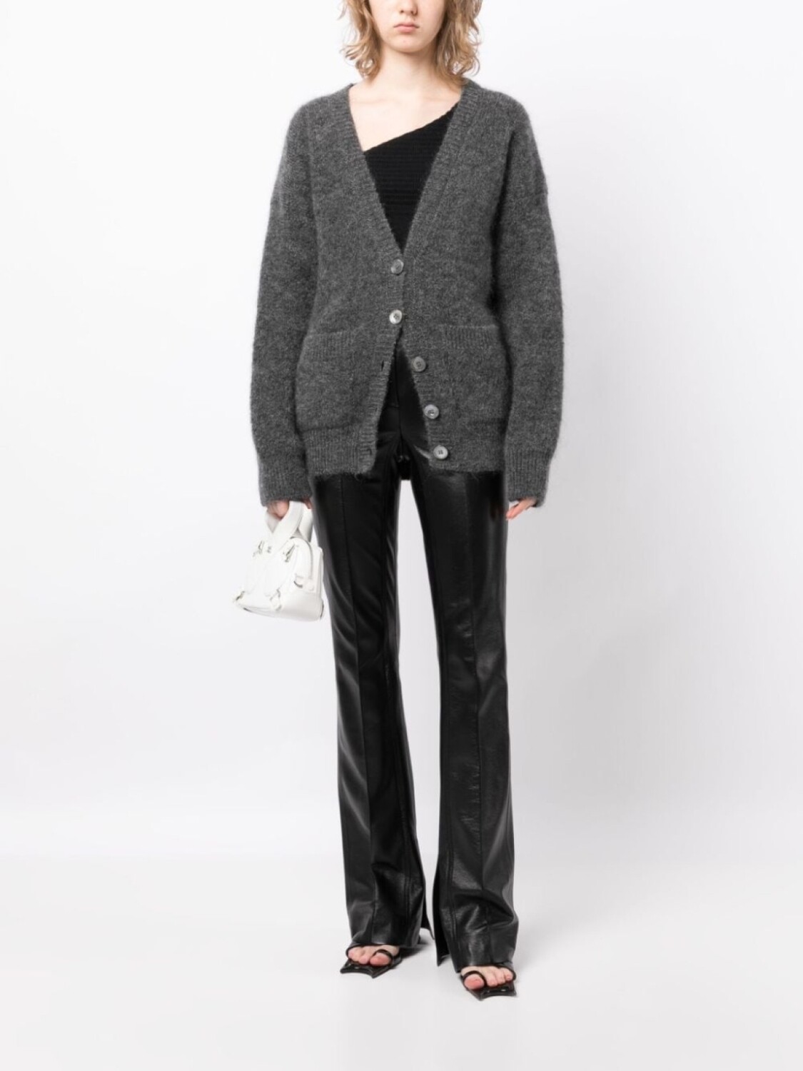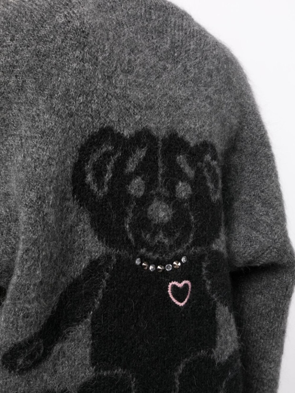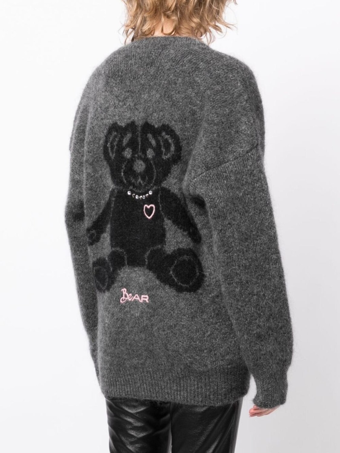 Серый, мохер, вязка в технике интарсия, изображение медведя, V-образный вырез, застежка на пуговицах спереди, длинные рукава, два накладных кармана по бокам и прямой подол.