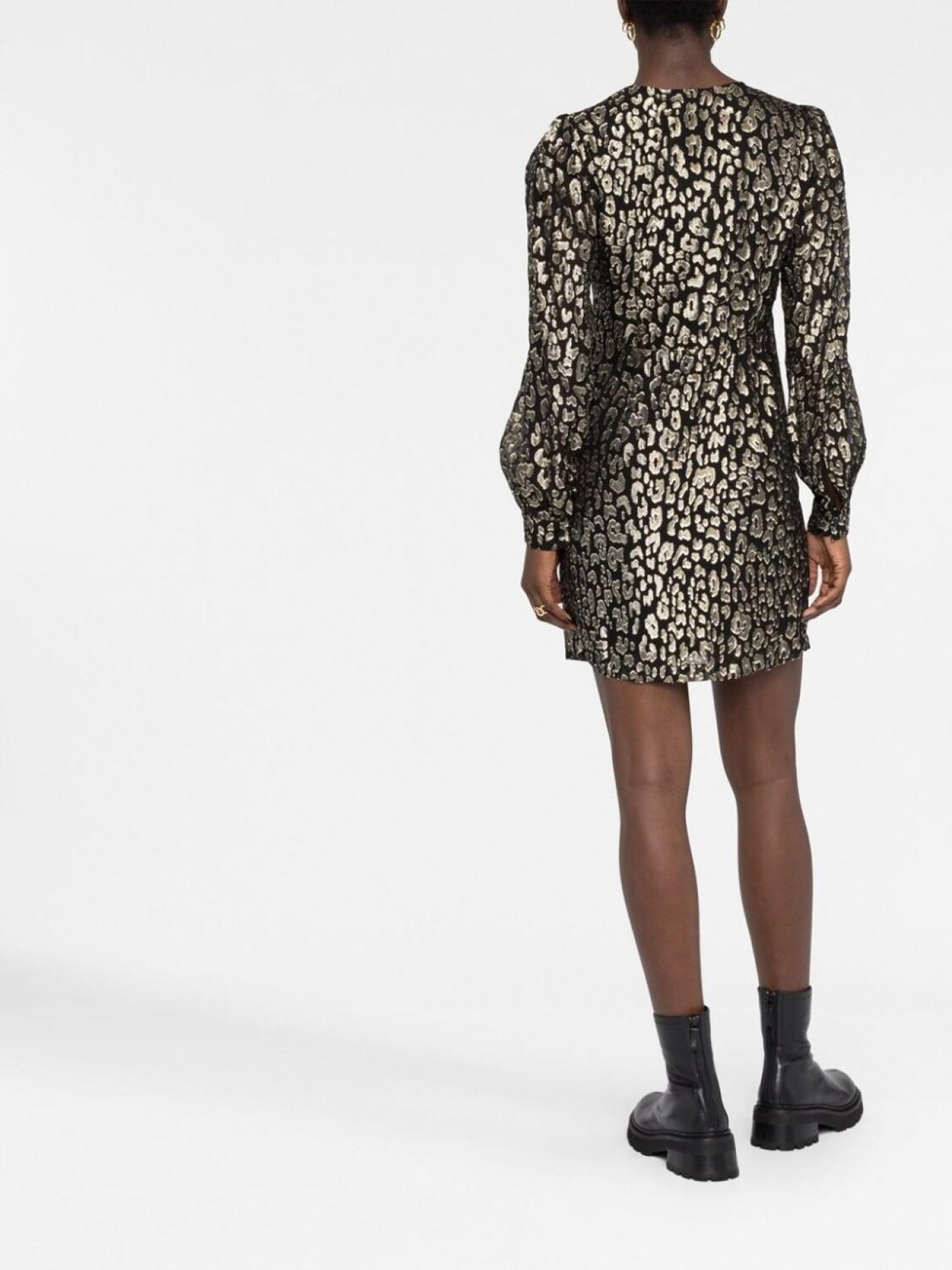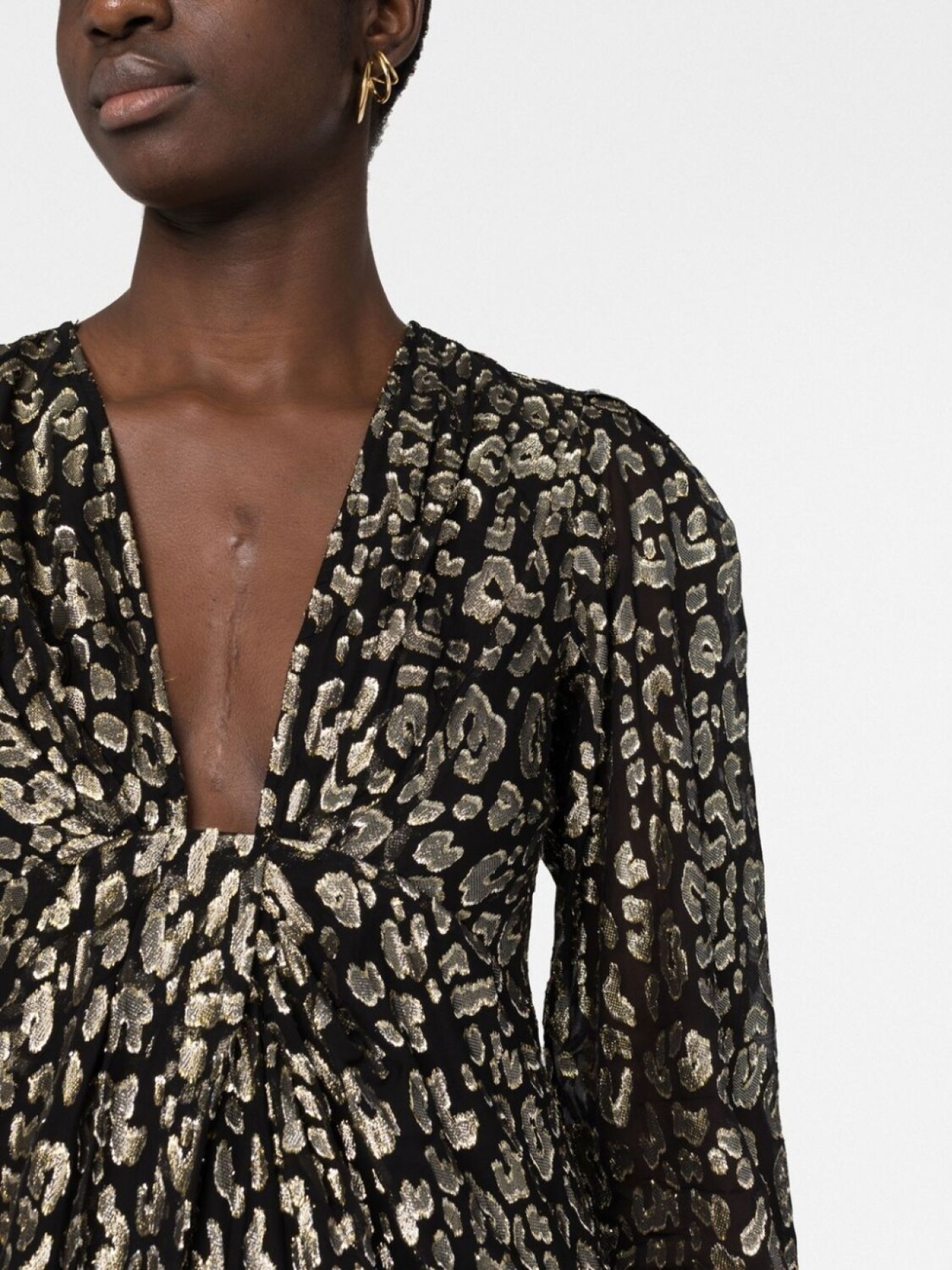 Черный, смесовый переработанный полиамид, покрытие с эффектом металлик, жаккардовый материал с узором, сплошной леопардовый принт, глубокий V-образный вырез, длинные рукава и длина до бедер.