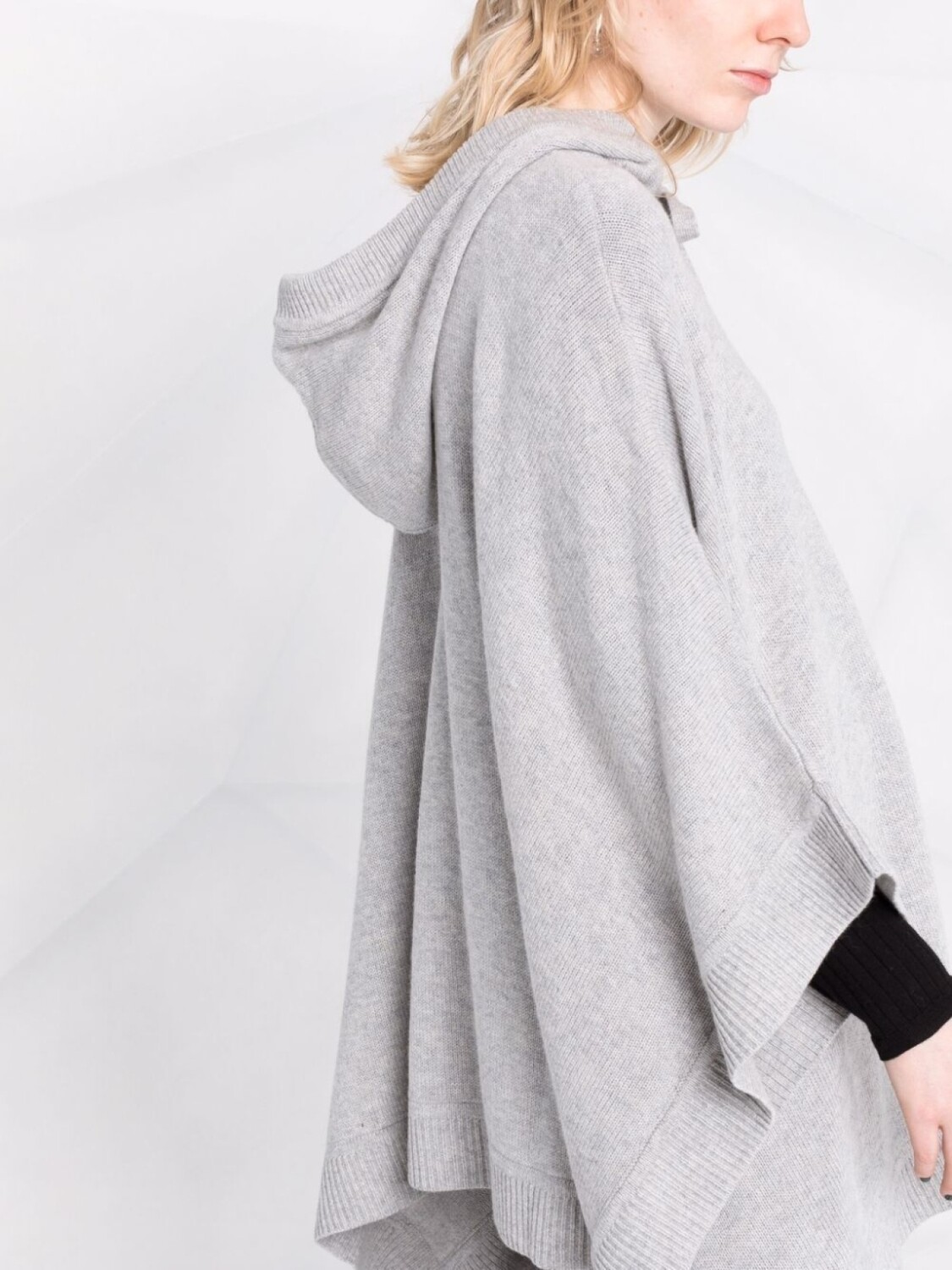 Асимметричный подол, объемный капюшон на шнурке, края в рубчик и тонкая вязка. Цвет: серый.