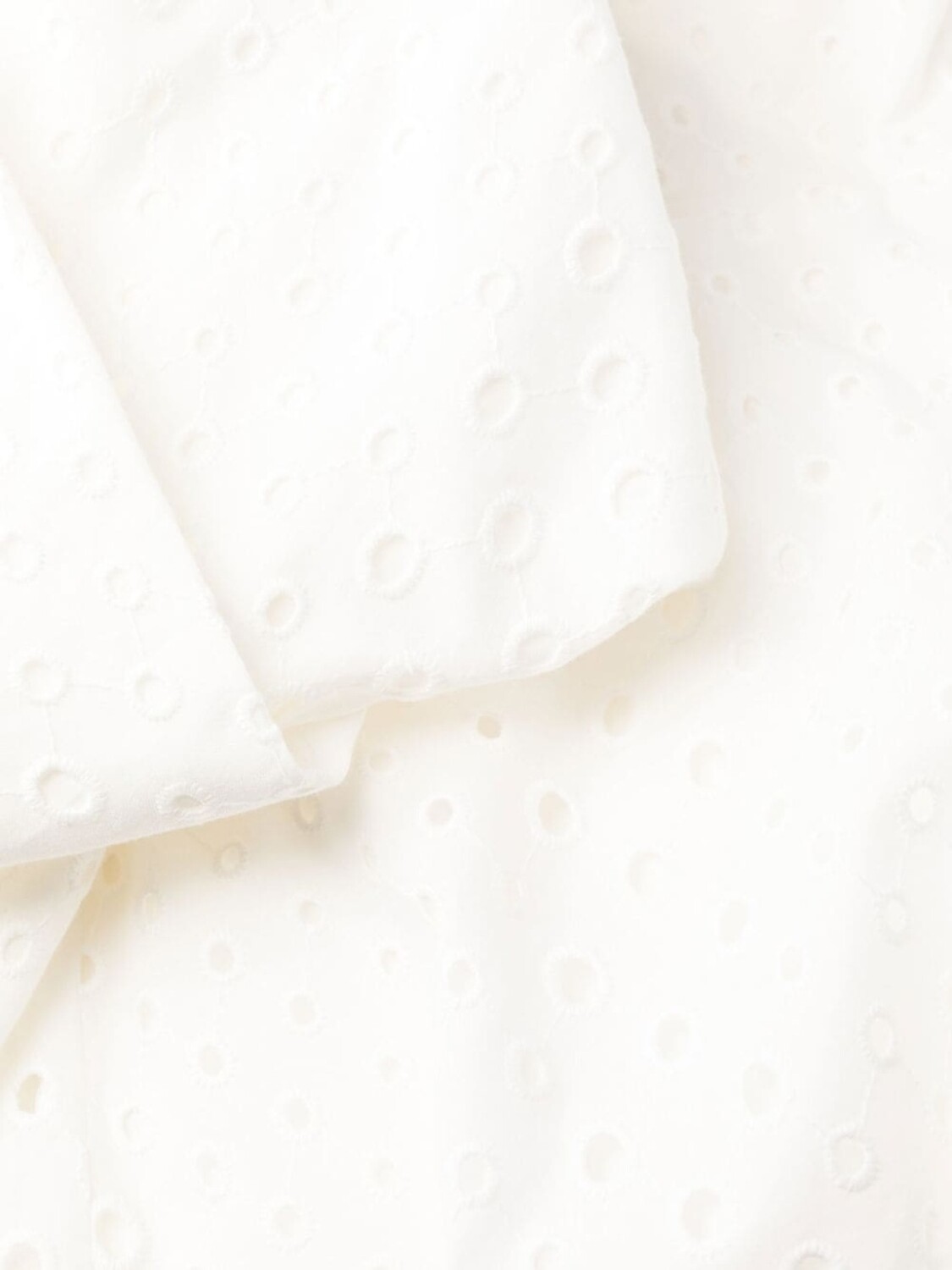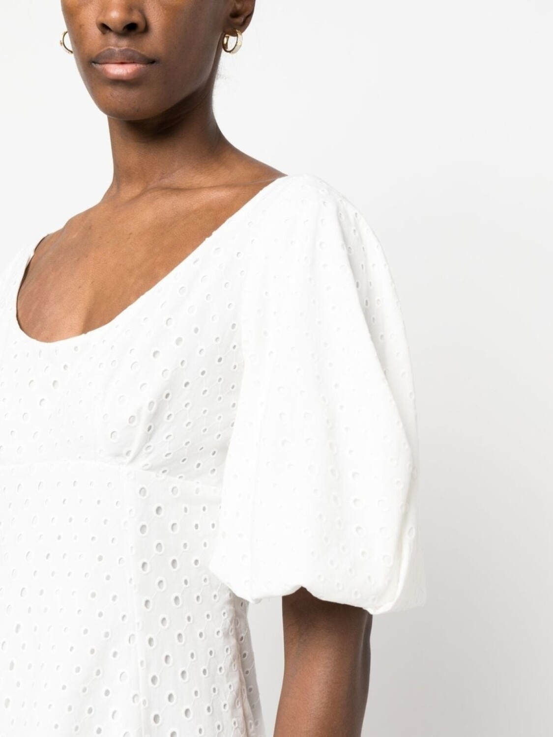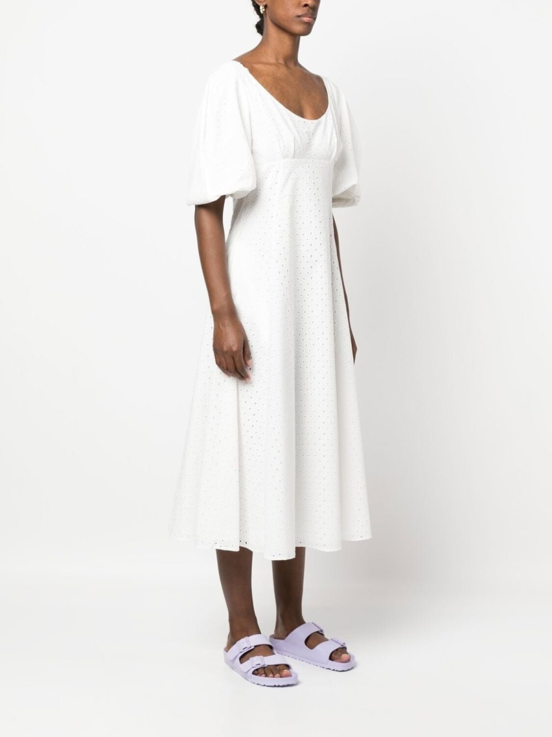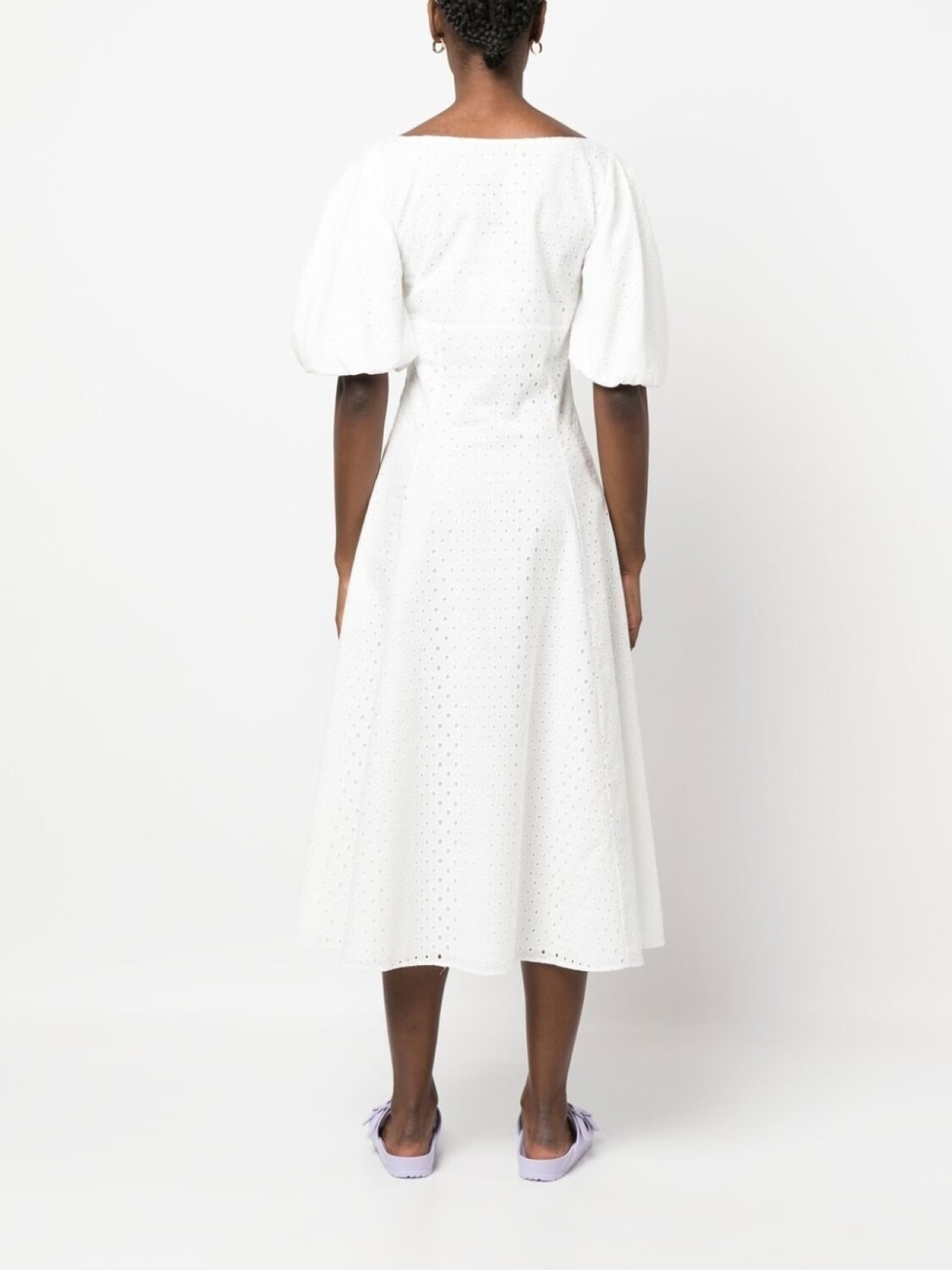 Белый, хлопок, вышивка, короткие объемные рукава, U-образный вырез, потайная застежка на молнии сбоку, расклешенный крой и длина до середины икры.