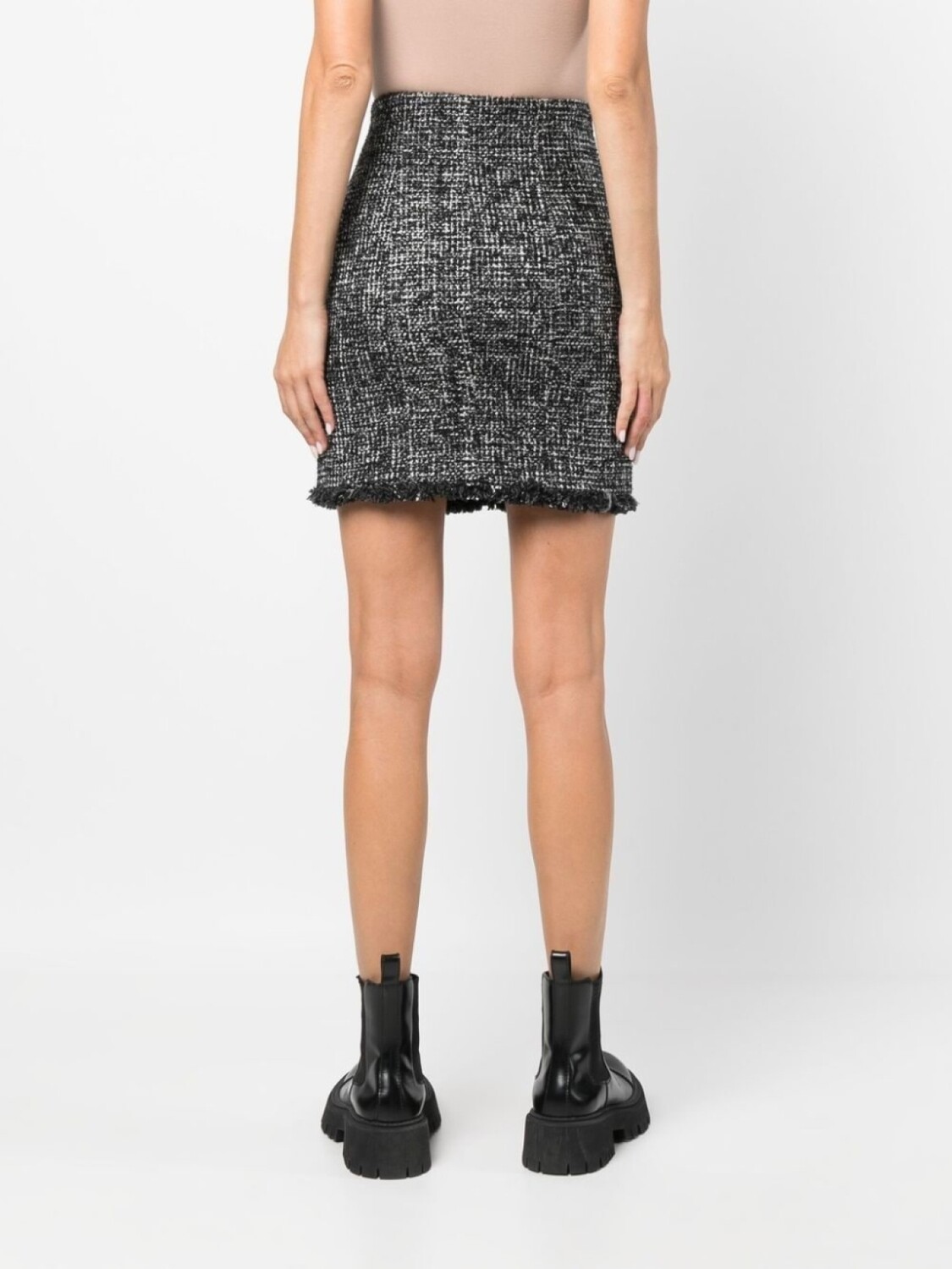Черный/белый, декоративная брошь, застежка на пуговицах спереди, два прорезных кармана по бокам и необработанные детали.