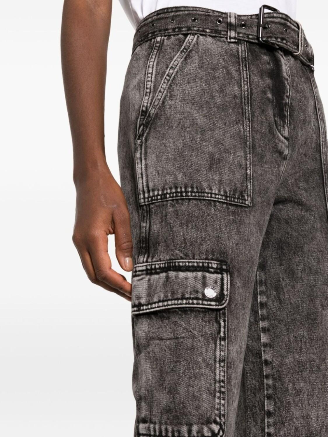 Черный, хлопок, обработанный деним, прямой крой, средняя посадка, потайная застежка на молнии и пуговицах, петли для ремня, два прорезных кармана по бокам, два накладных кармана по бокам и два кармана с листочкой сзади.