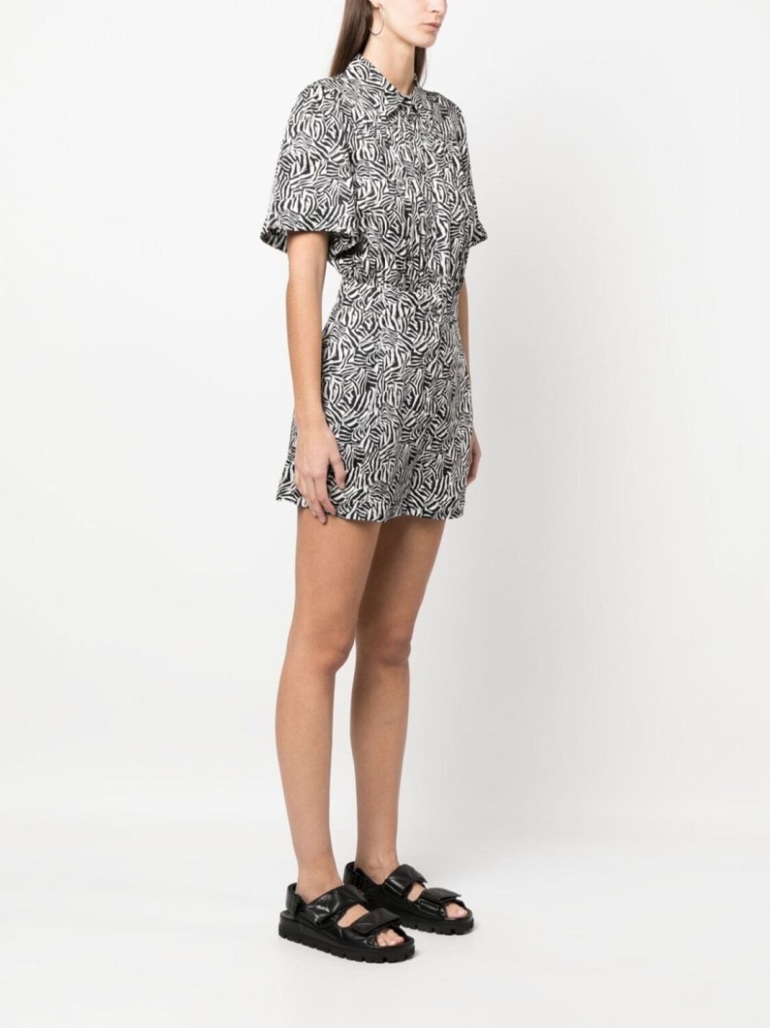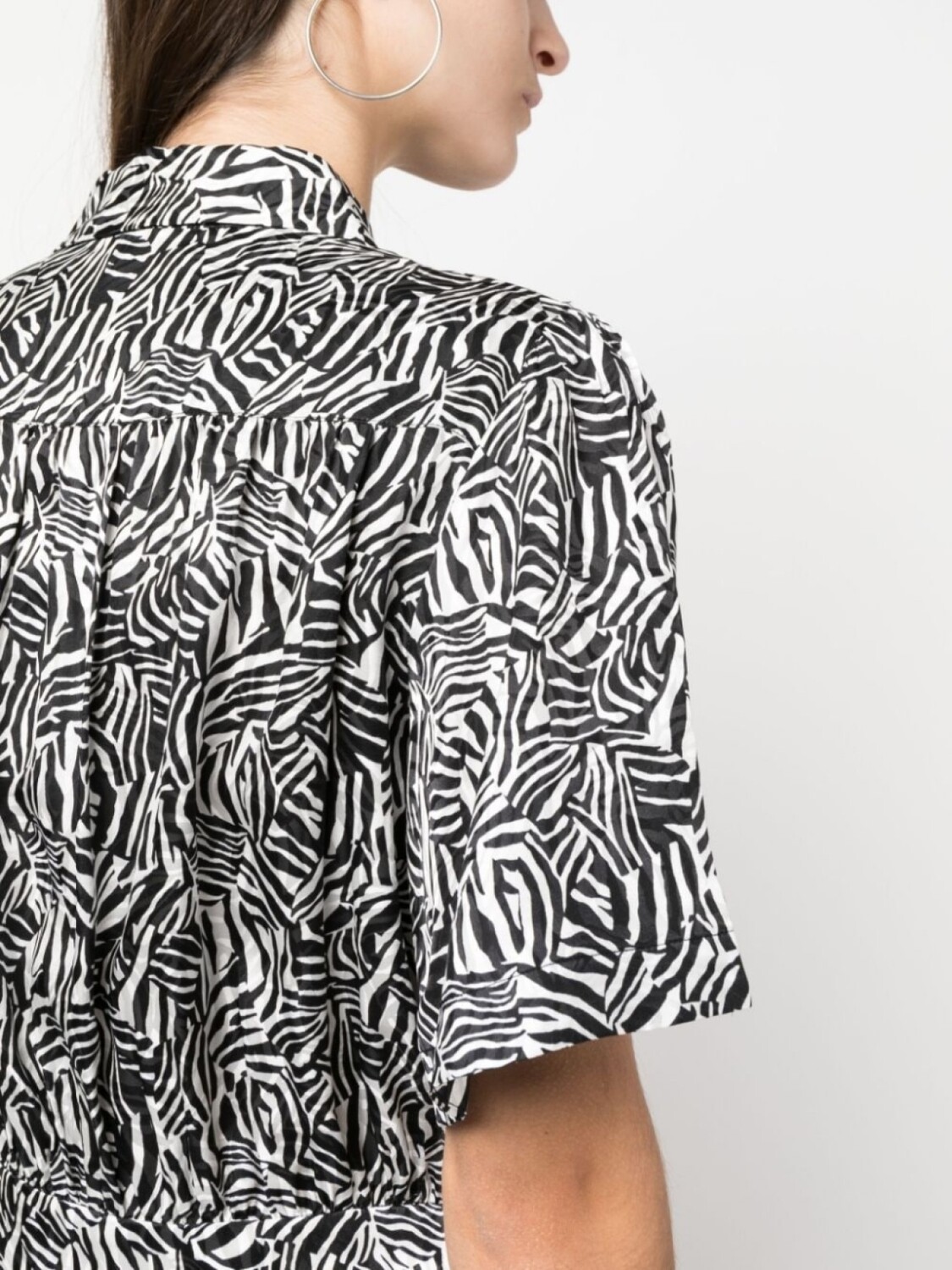 Белый/черный, смесовый переработанный полиамид, смесовый шелк, зебровый принт, складки, классический воротник, короткие рукава, эластичный пояс, застежка на пуговицах спереди и прямой подол.