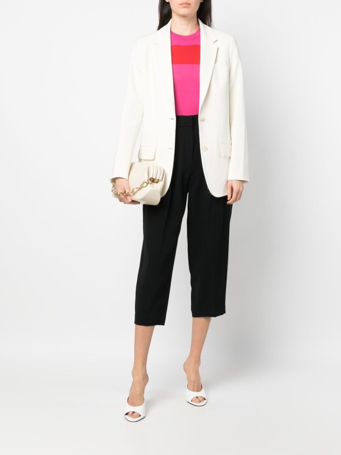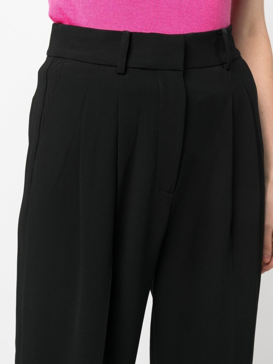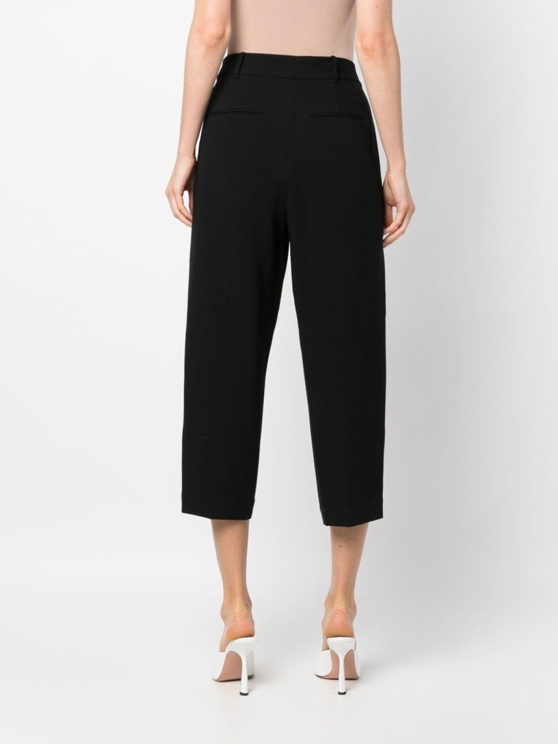 Черный, складки, завышенная талия, петли для ремня, потайная застежка спереди, два кармана с листочкой сзади и укороченная длина.
