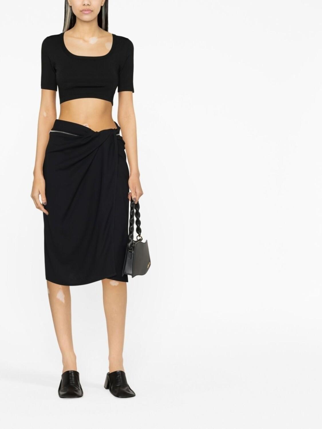 Черный, модель на запах, дизайн со сборками, завышенная талия, круговая молния, карман на молнии сзади, прямой подол и длина миди.