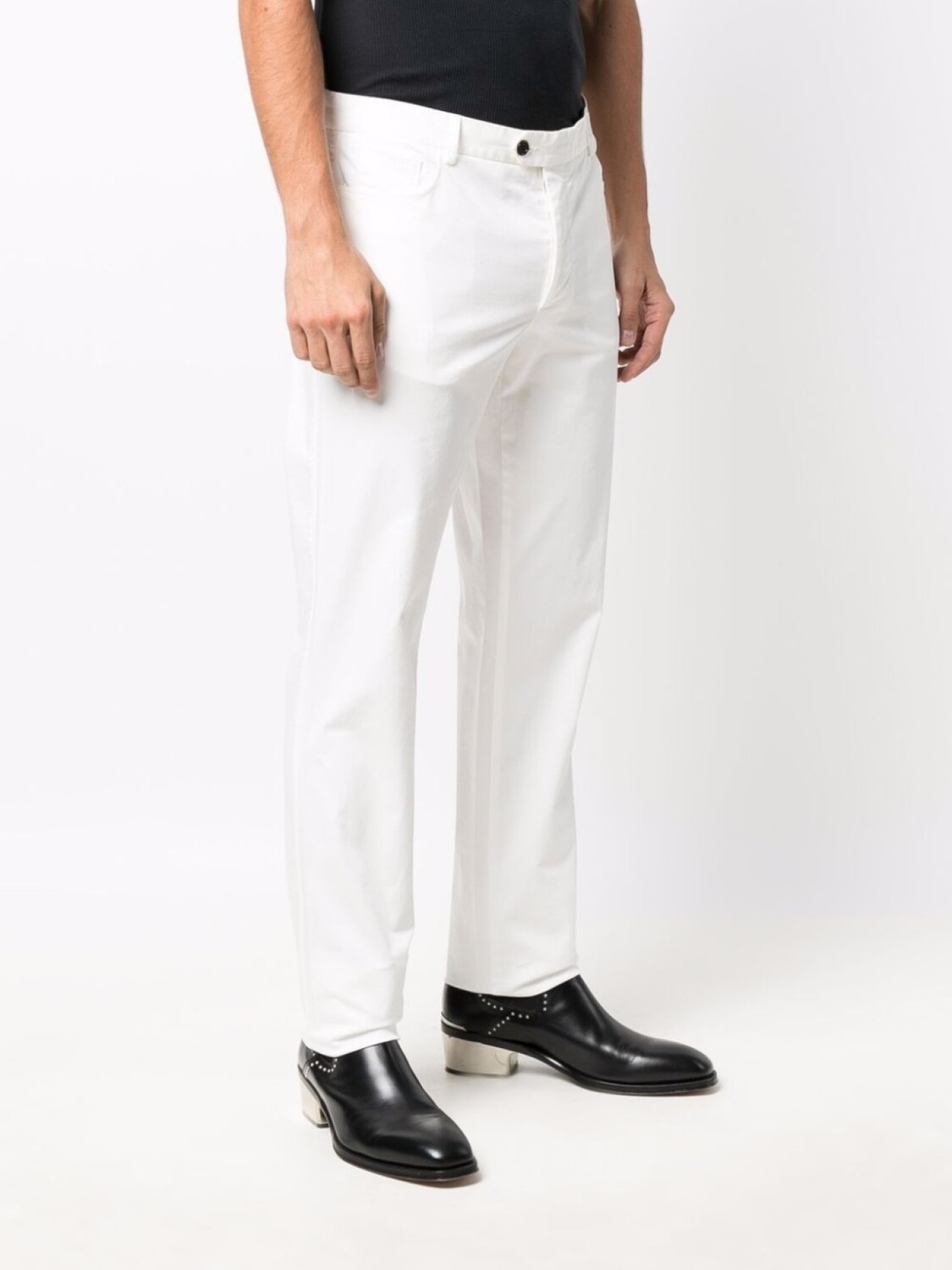 Нашивка с логотипом сзади, петли для ремня, потайная застежка спереди, классическая пятикарманная модель и узкий крой. Цвет: белый.
