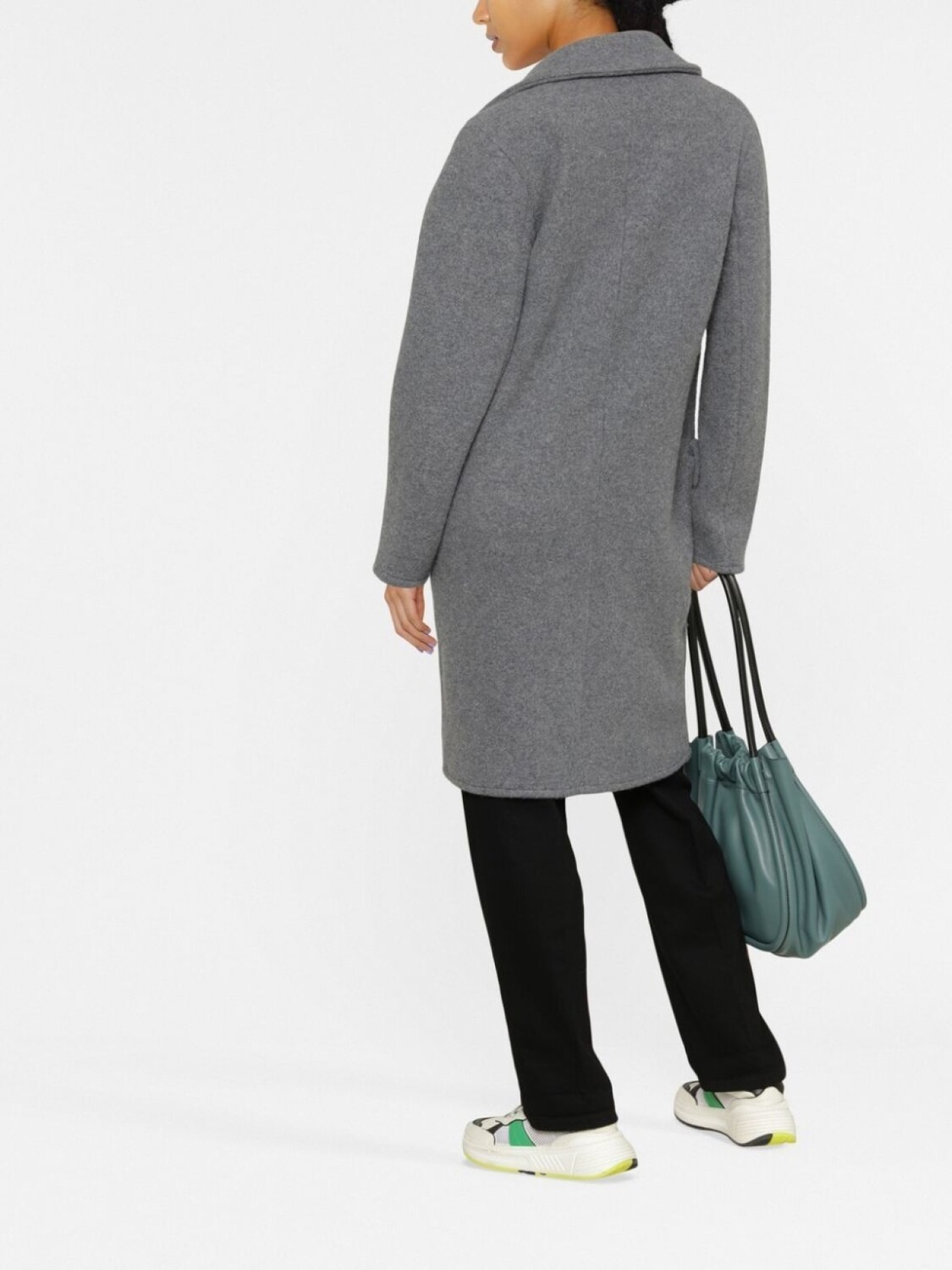 Серый, смесовая необработанная шерсть, двубортная застежка на кнопки, широкие зазубренные лацканы, два кармана с клапанами по бокам и длина по колено.