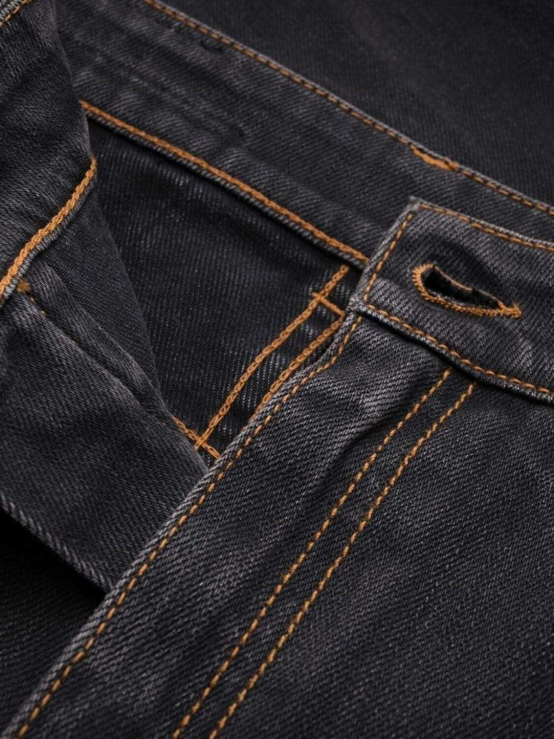 Черный, смесовый хлопок, эффект потертости, нашивка с логотипом сзади, контрастная строчка, крой bootcut, петли для ремня и застежка на молнии и пуговице спереди.
