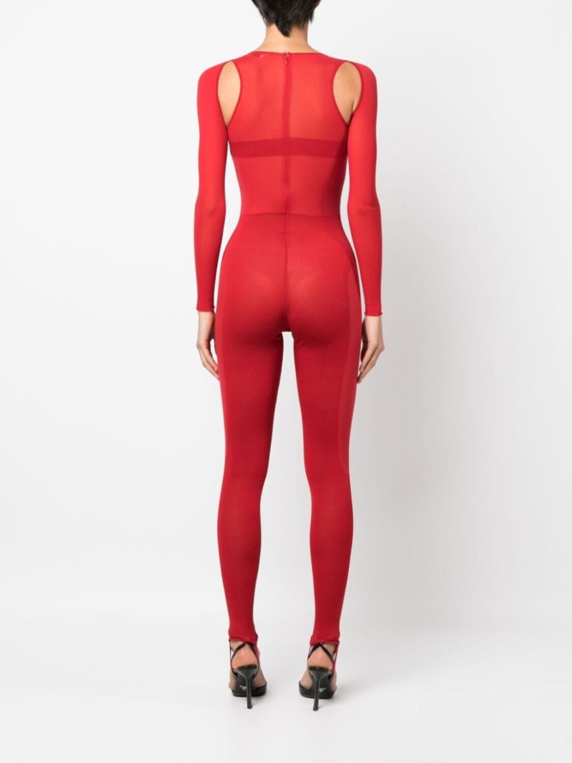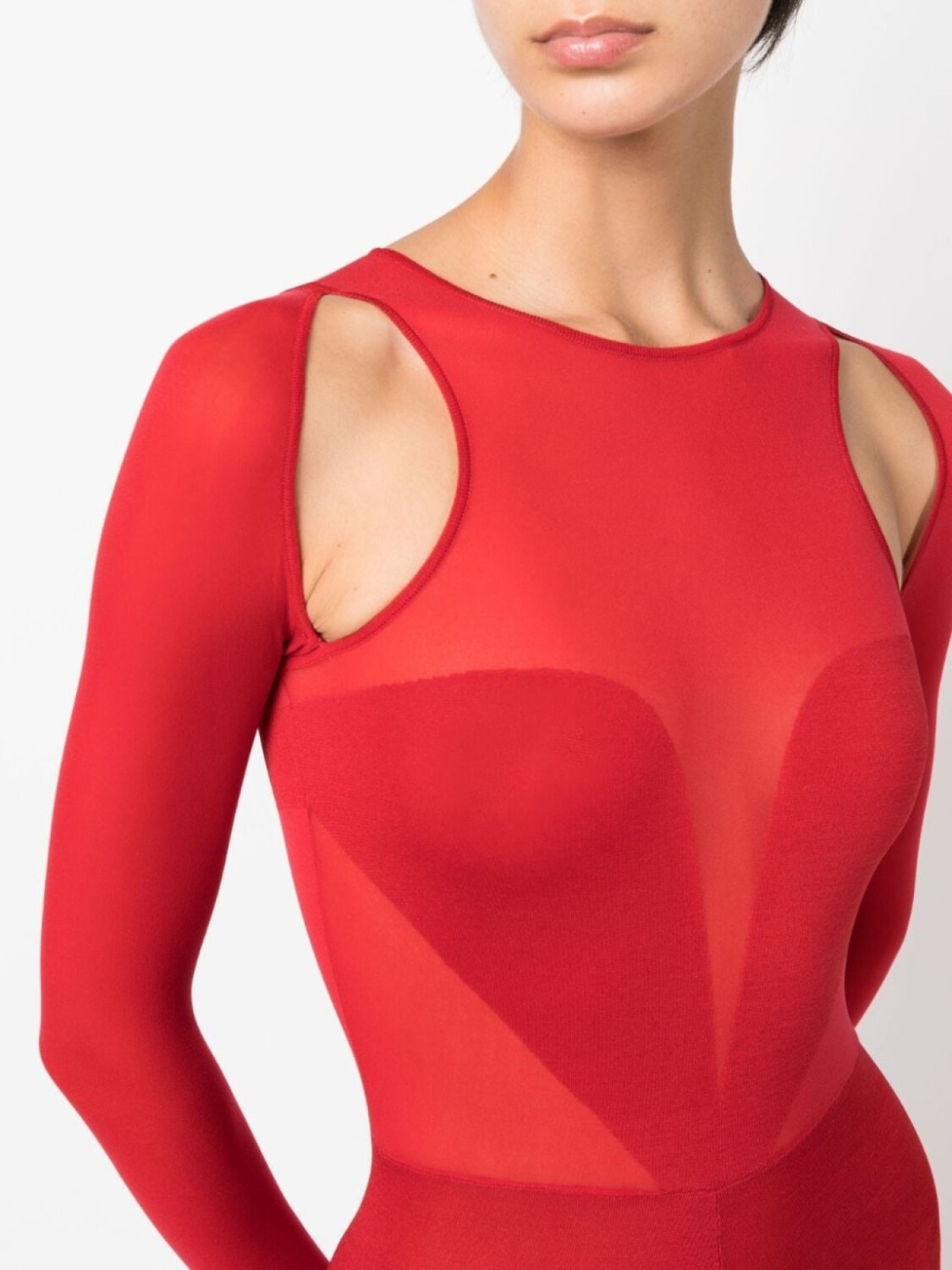 Красный, смесовый шелк, эластичный материал, полупрозрачный дизайн, вырезные детали, вырез-лодочка, длинные рукава и узкий облегающий крой.