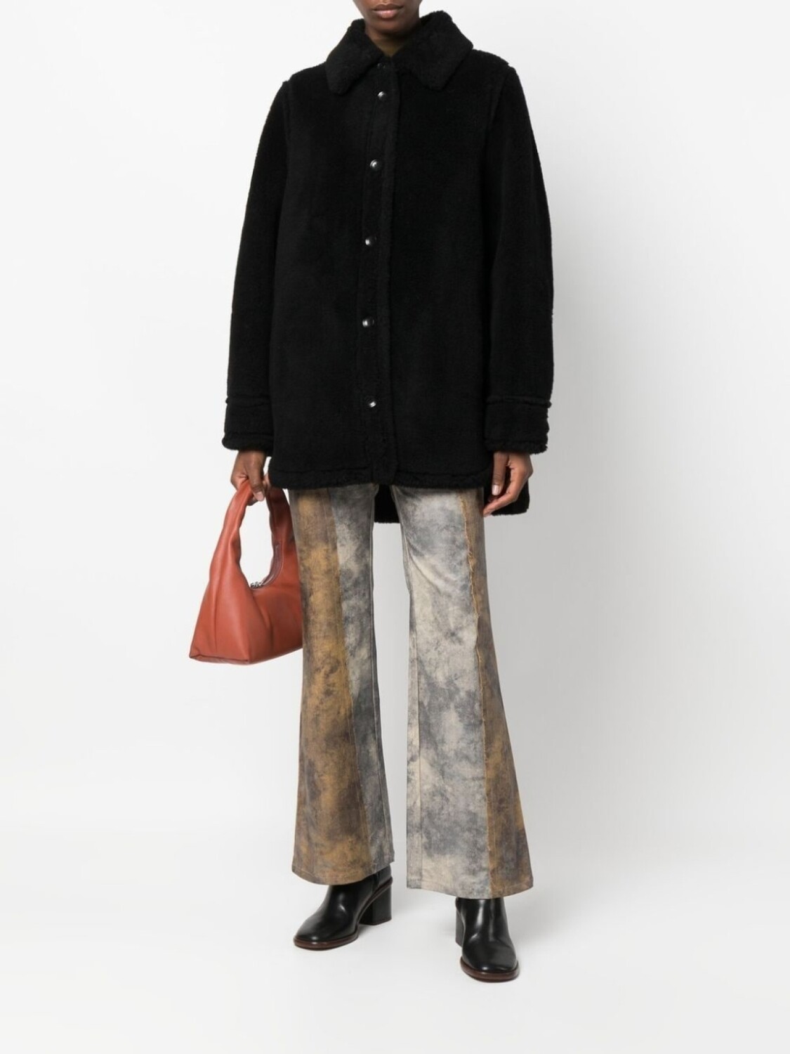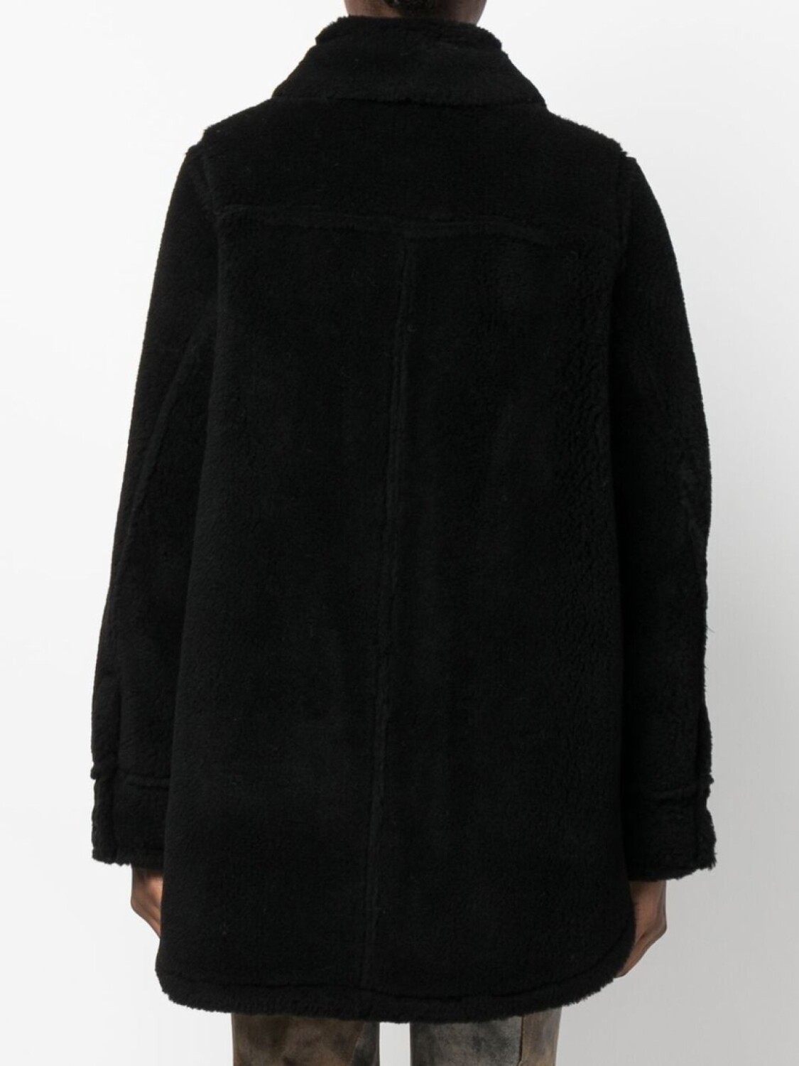 Черный, шерсть, фактурная отделка, широкий заостренный воротник, асимметричная застежка на пуговицах спереди, два прорезных кармана по бокам, модель без подкладки и закругленный подол сзади.