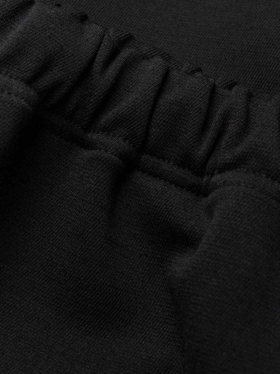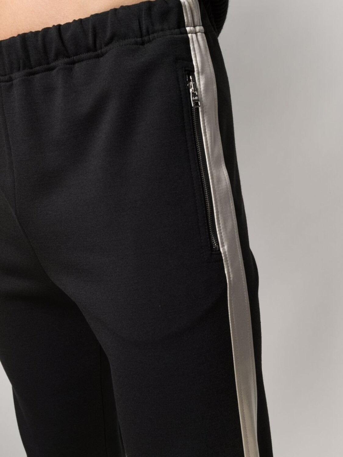 Полоска сбоку, узкий крой, эластичный пояс и два кармана на молнии по бокам.
